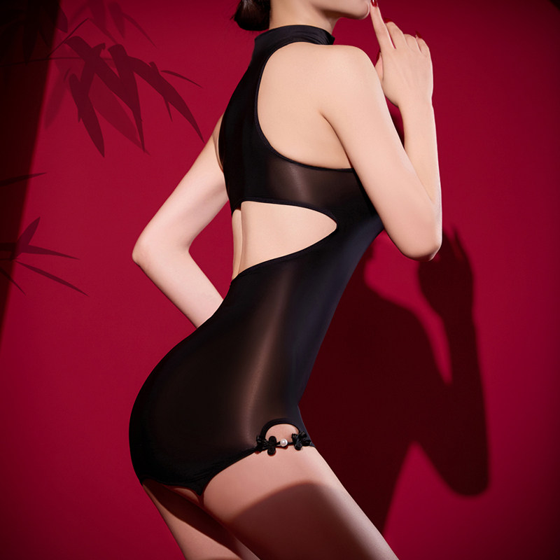 卿荷薄性感中式 旗袍马油光亮连身黑丝袜镂空诱惑珍珠盘扣制服套装