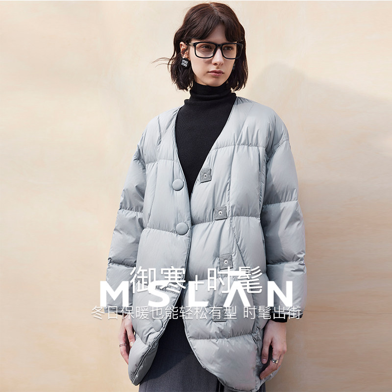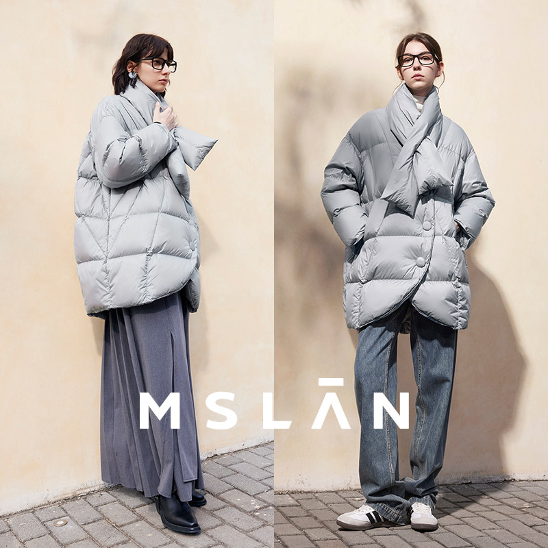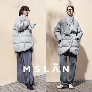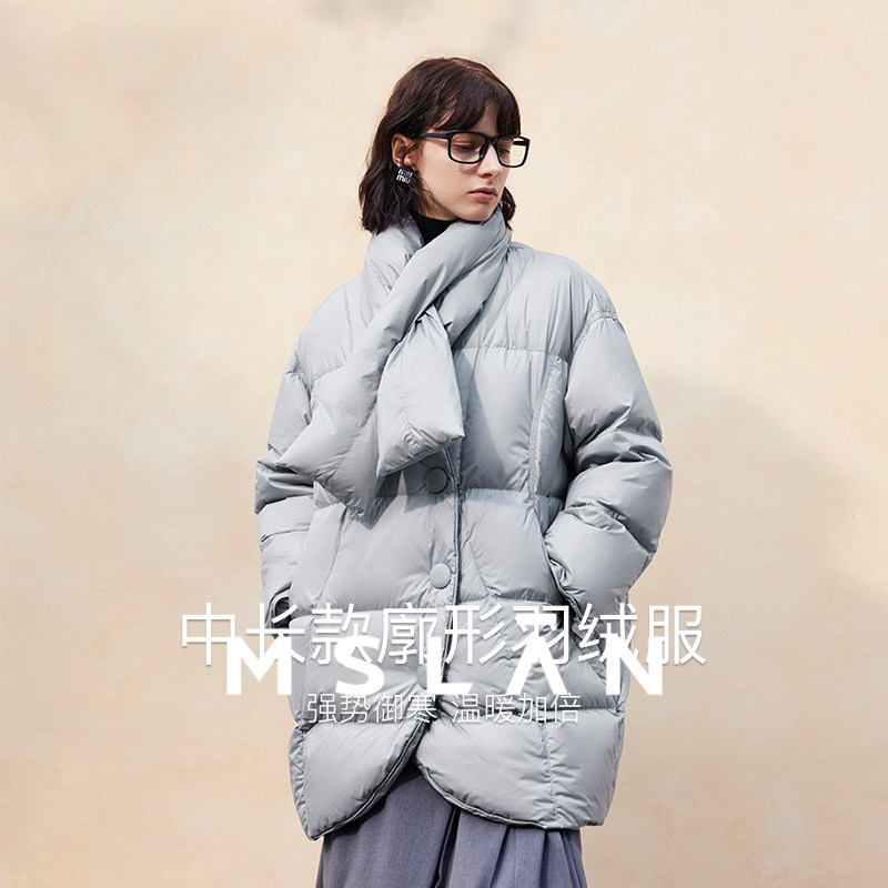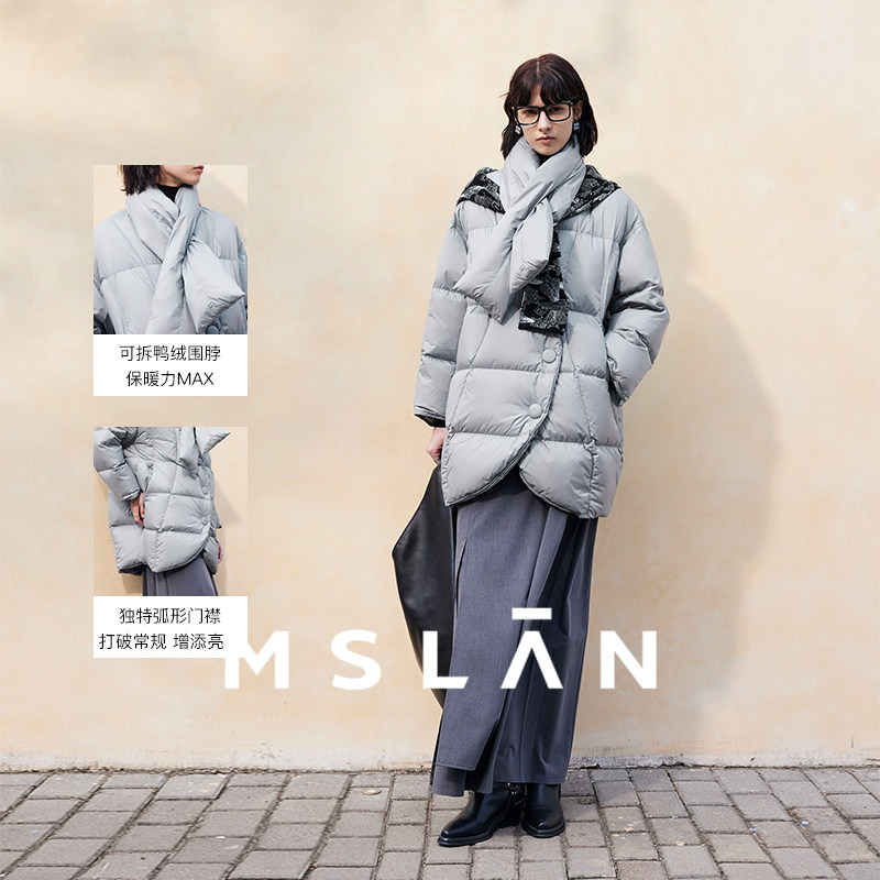 MSLAN灰调美学 蓝色茧型羽绒服外套 可拆围巾领防风保暖中长款