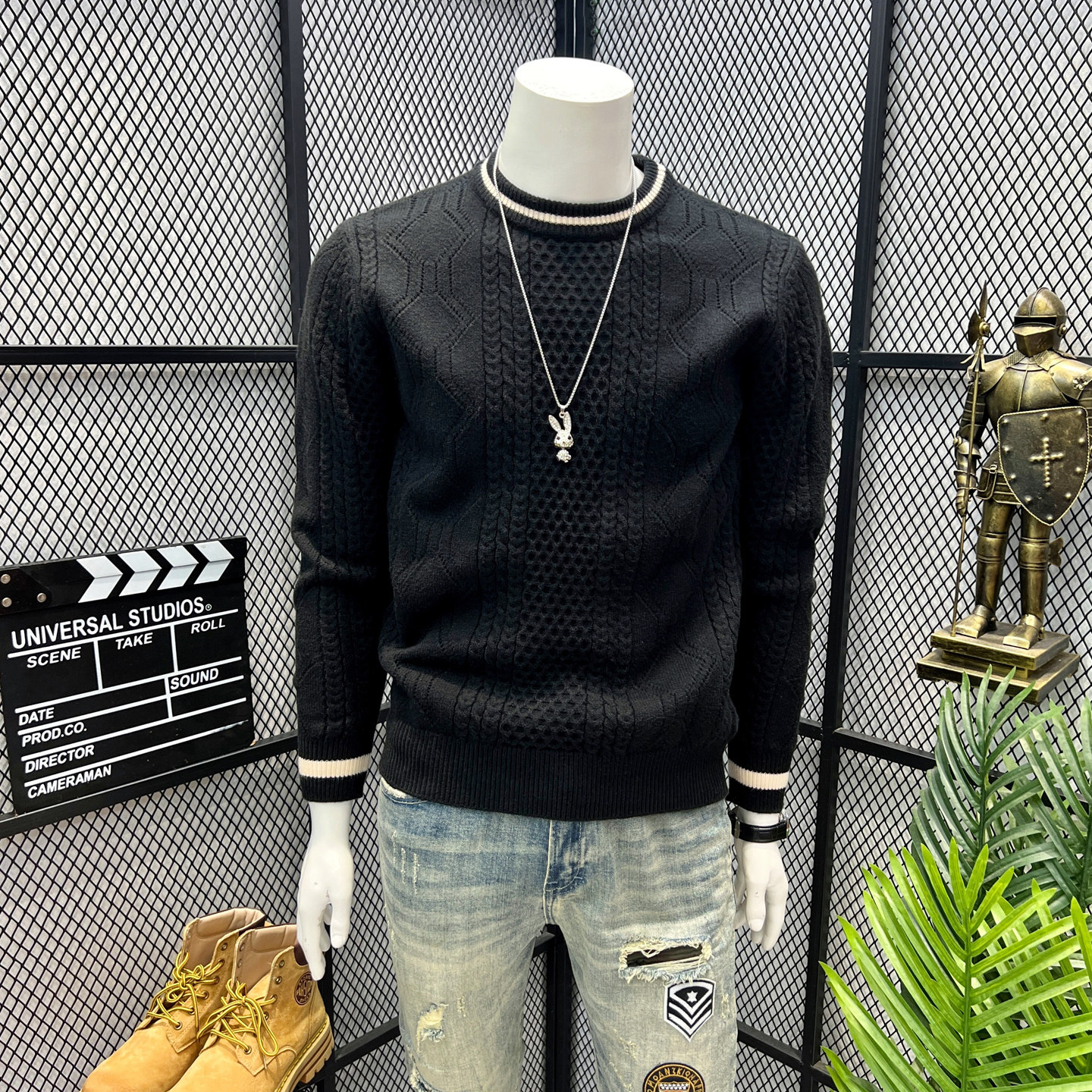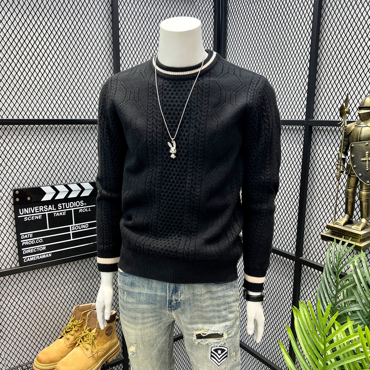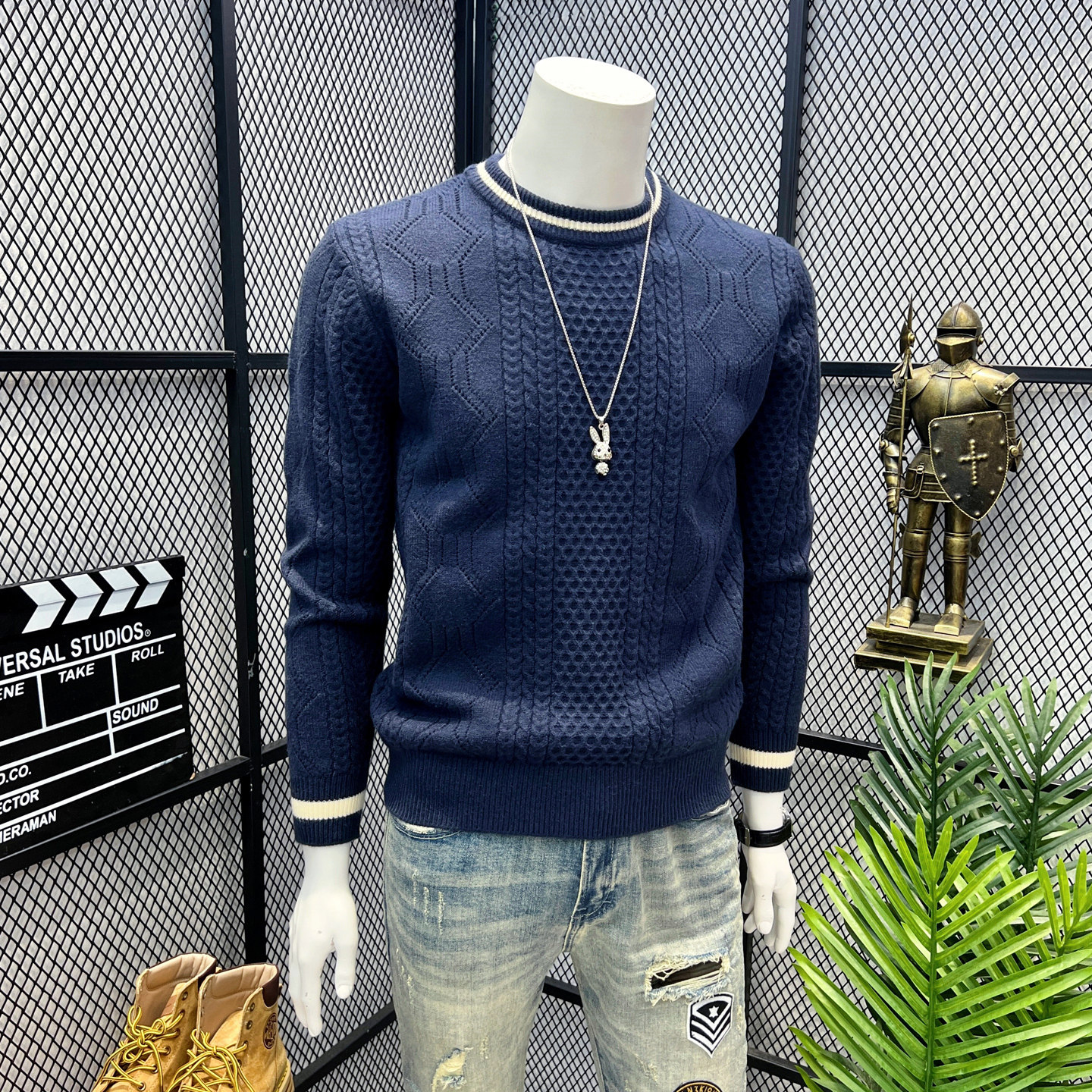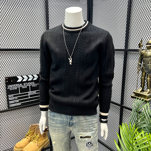 毛衣男冬季 英伦复古麻绳嵌花衣服男款 拼色修身 时尚 保暖圆领针织衫