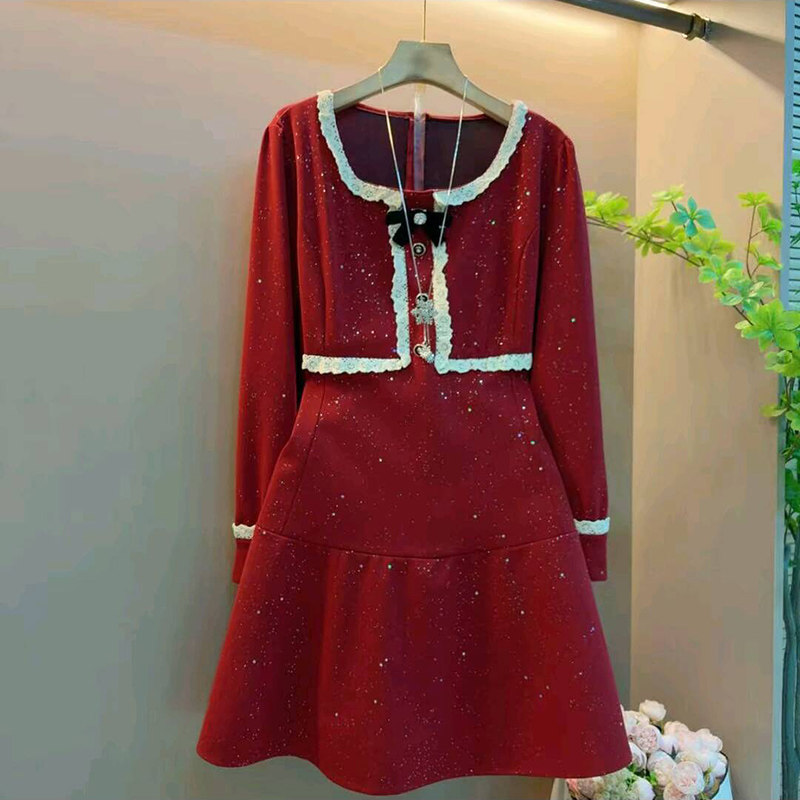 胖mm蕾丝花边拼接洋气裙 女装 新款 小香风设计感高腰显瘦连衣裙大码