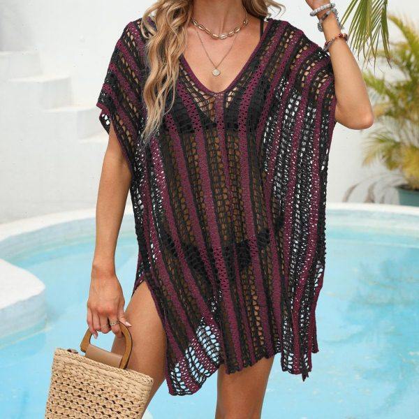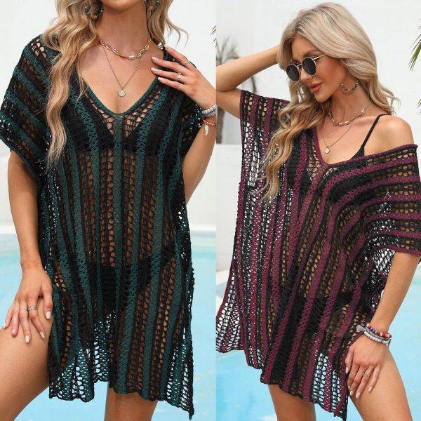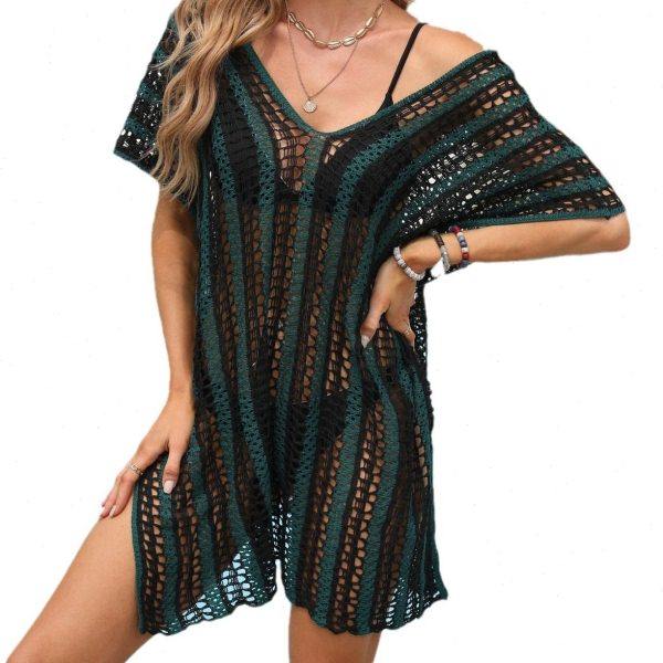 拼接镂空针织沙滩罩裙比基尼外搭罩衫 欧美沙滩遮挡裙泳衣短款 罩衫