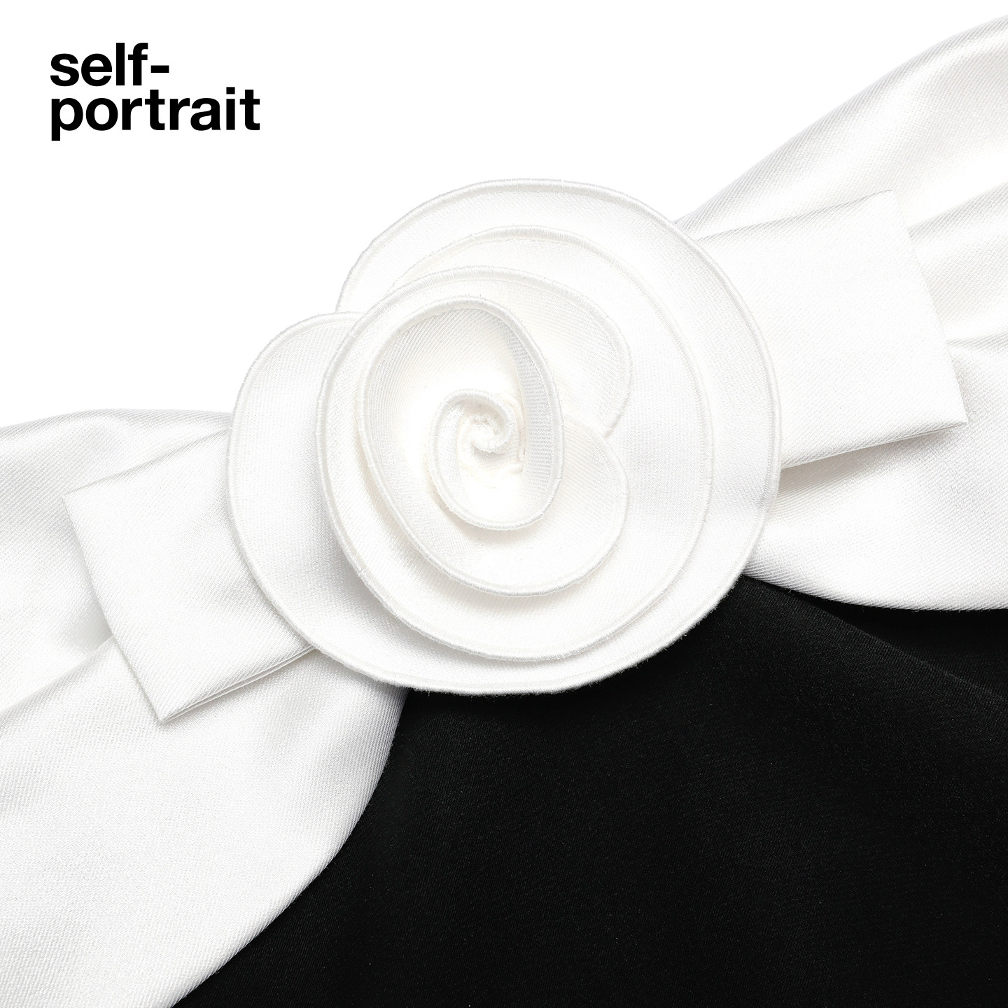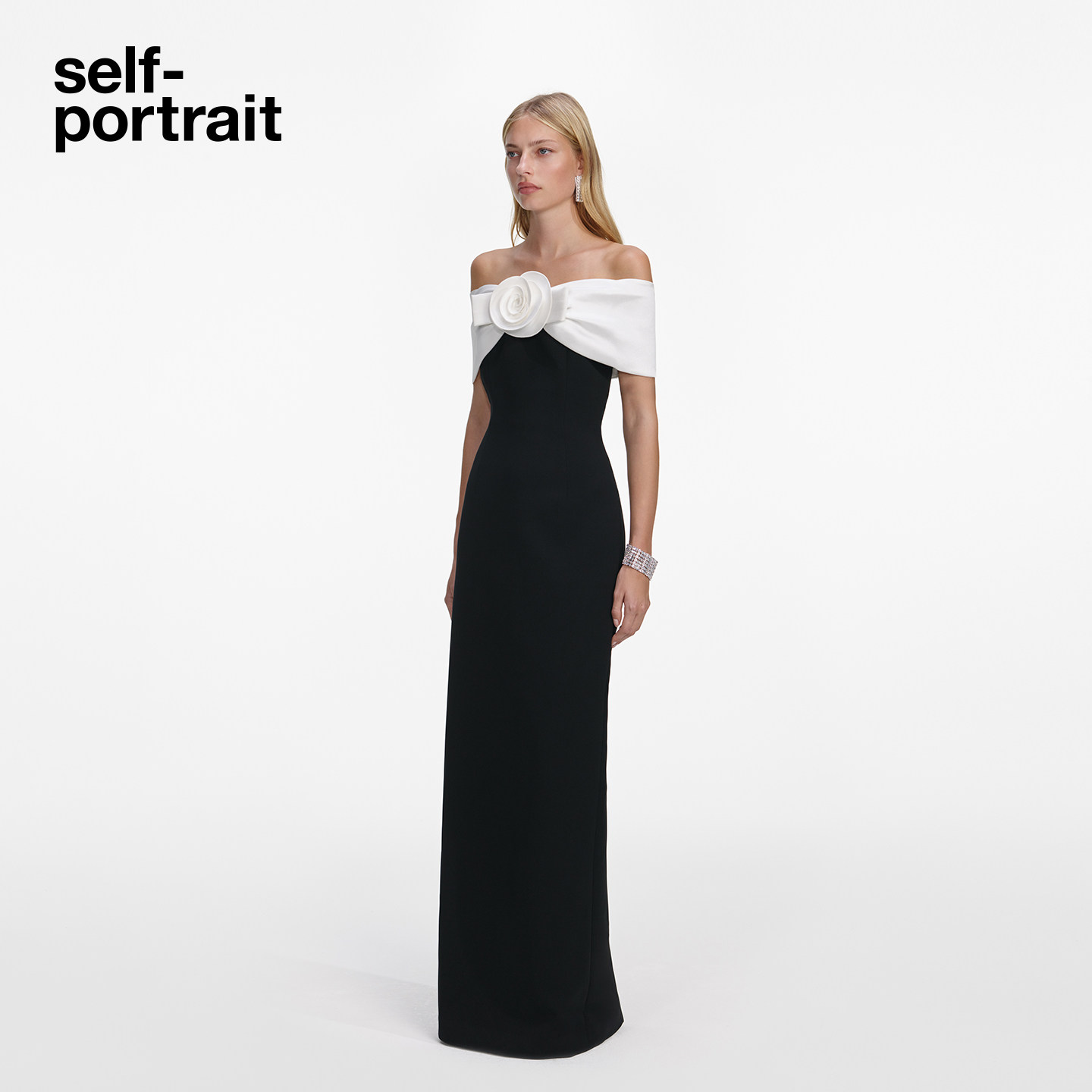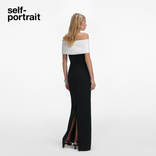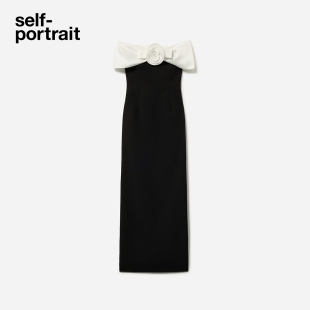 黑撞白花朵装 2026早春新款 饰一字肩连衣裙中长裙 portrait self