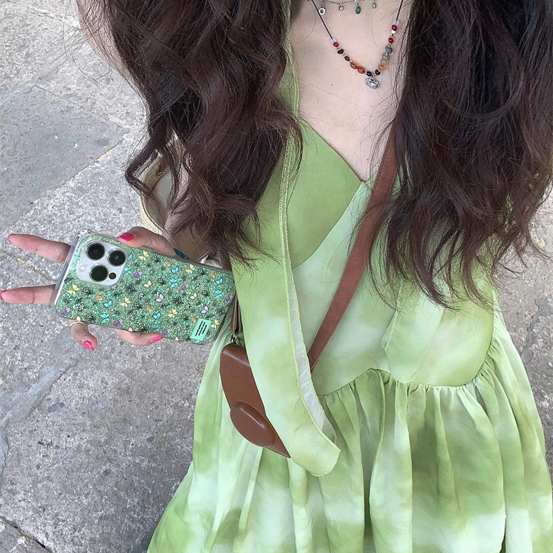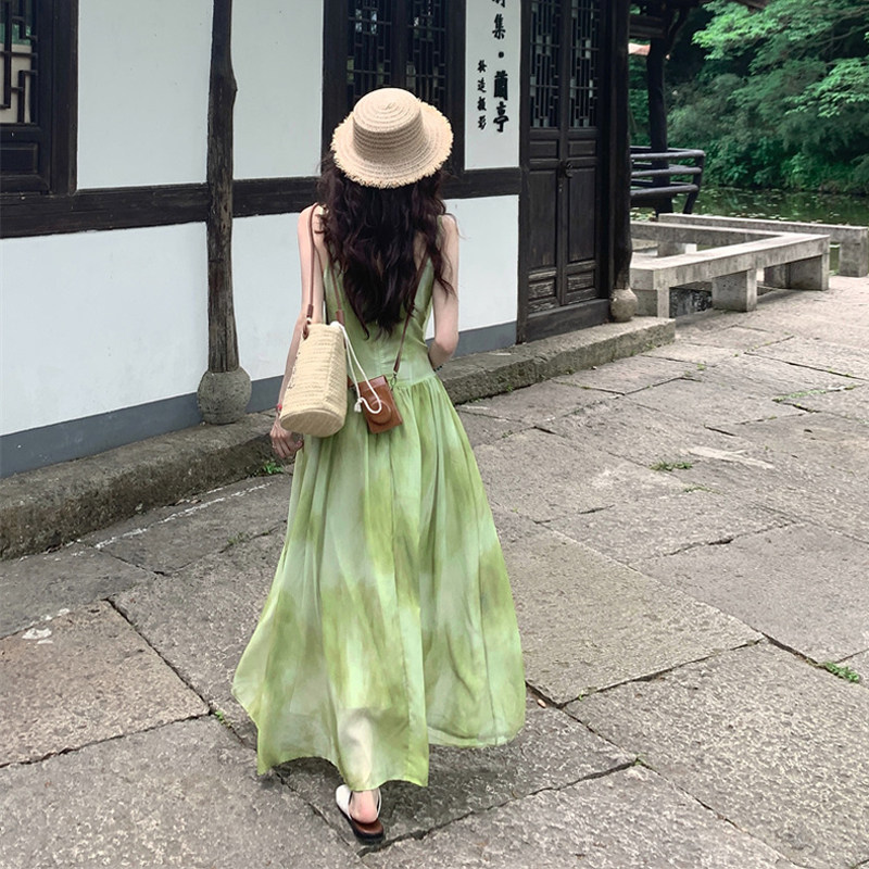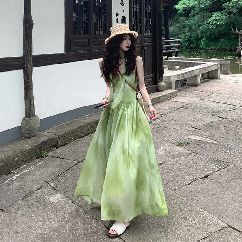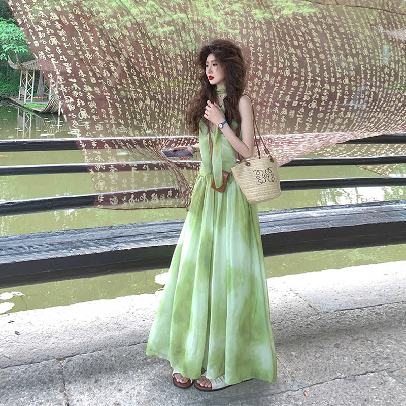 云南大理旅游穿搭女装 海边度假长裙复古绿色扎染吊带连衣裙女夏季
