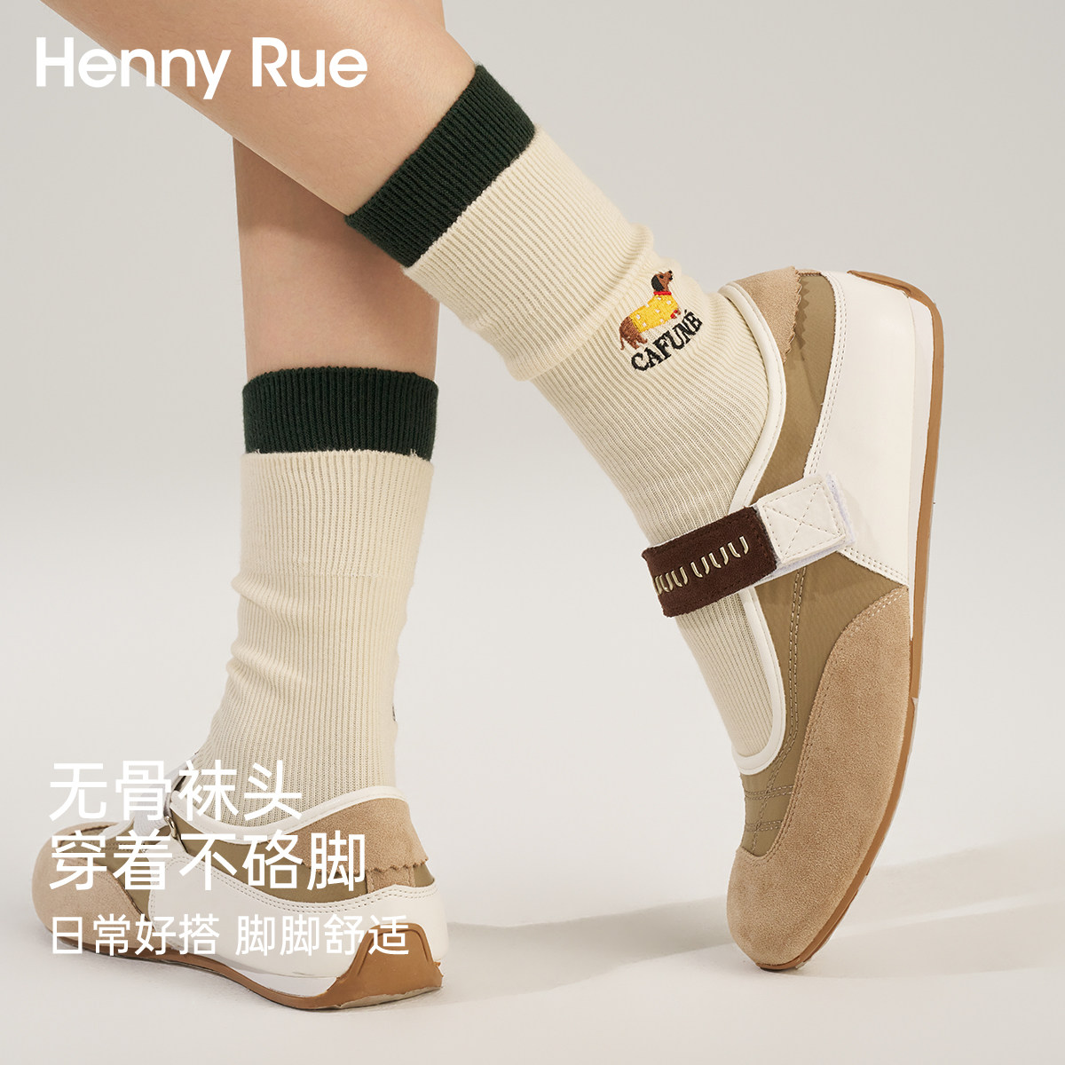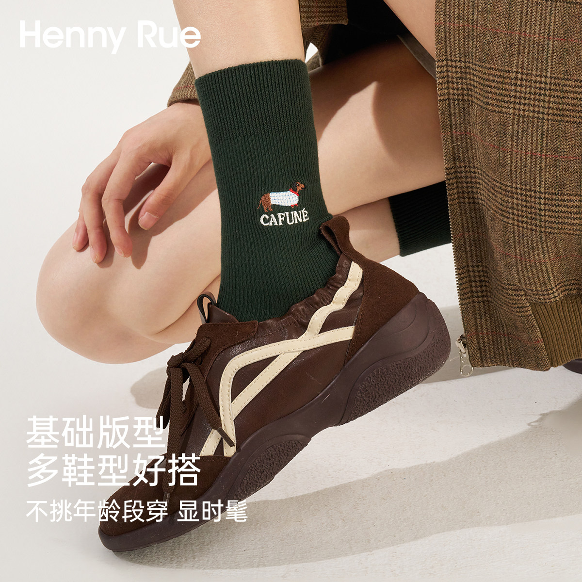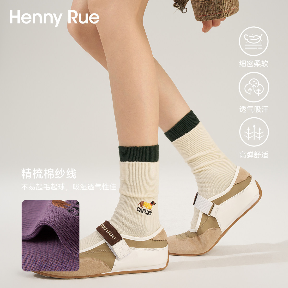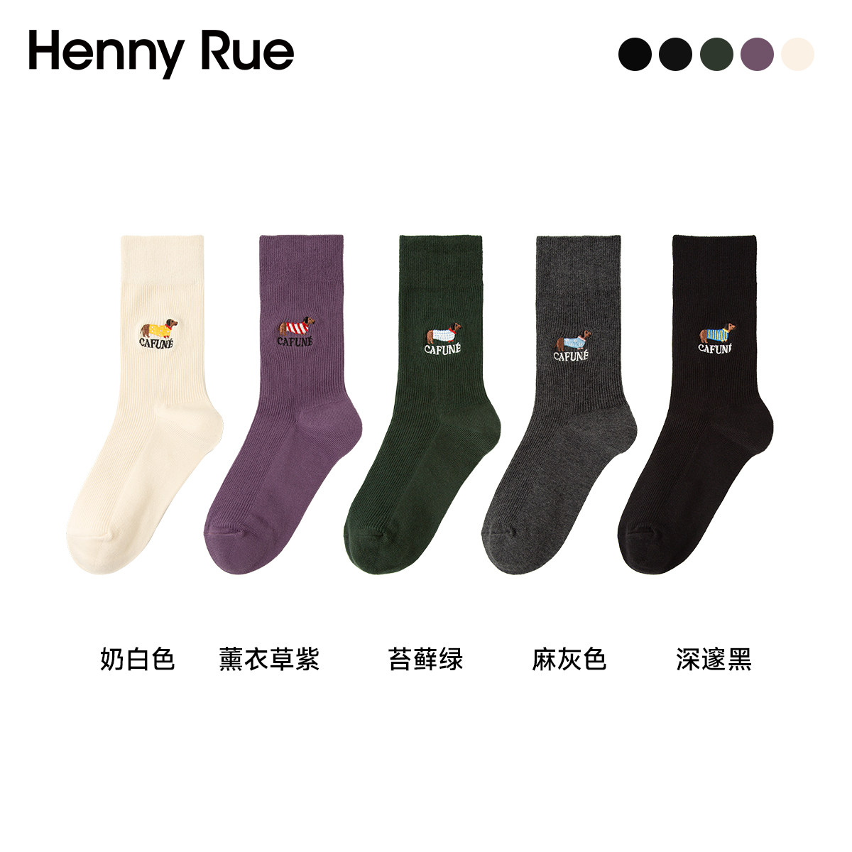 HENNY RUE亨尼露可爱女士腊肠狗刺绣坑条中筒袜