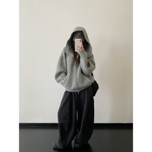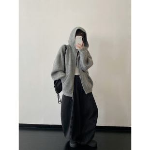 sun柚 上衣女 马海毛毛衣外套百搭学院风高级感宽松针织连帽开衫