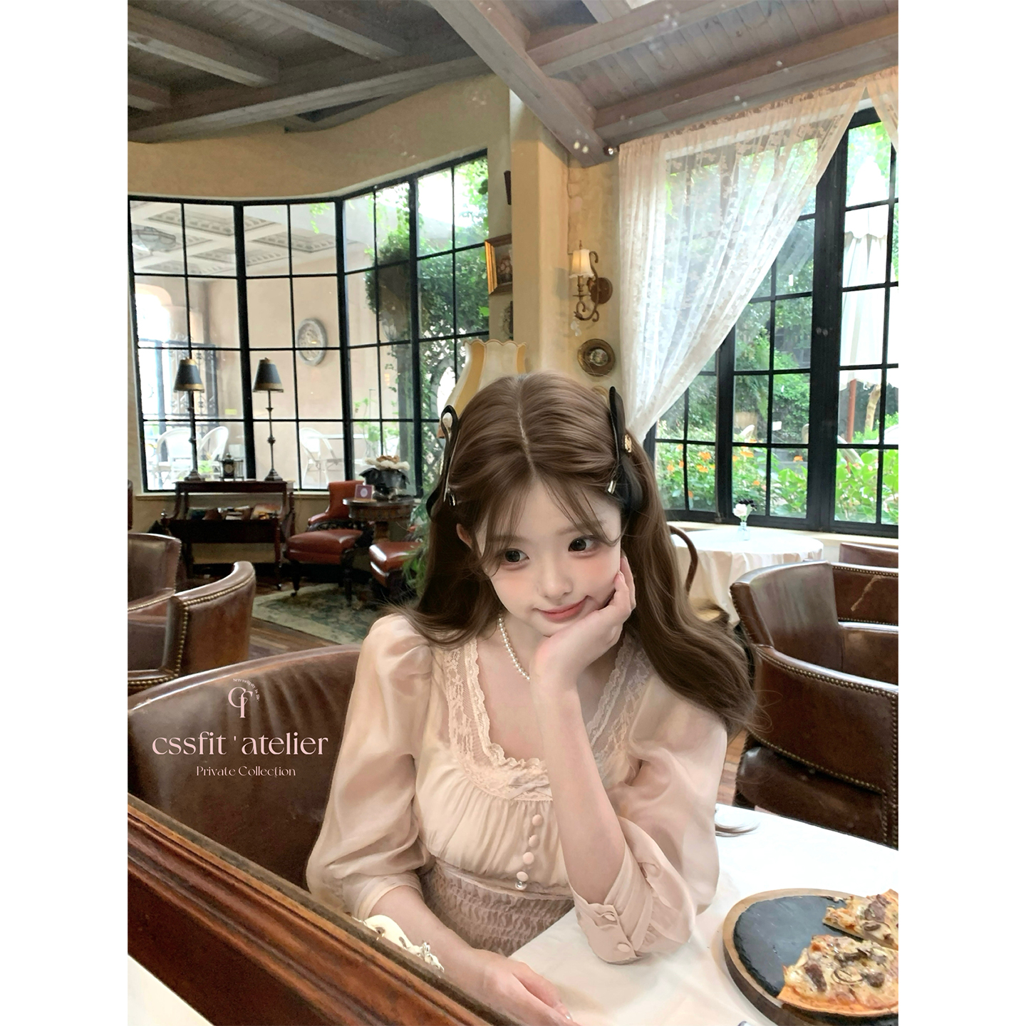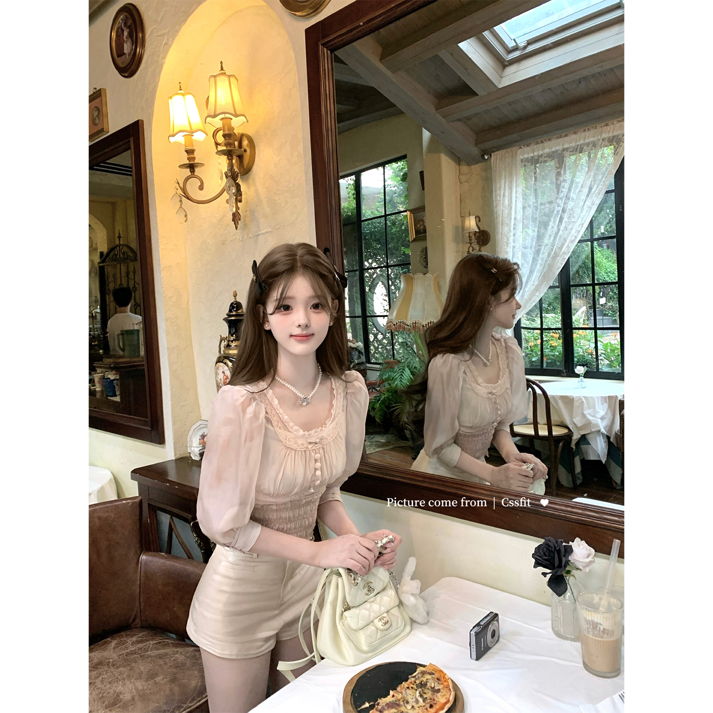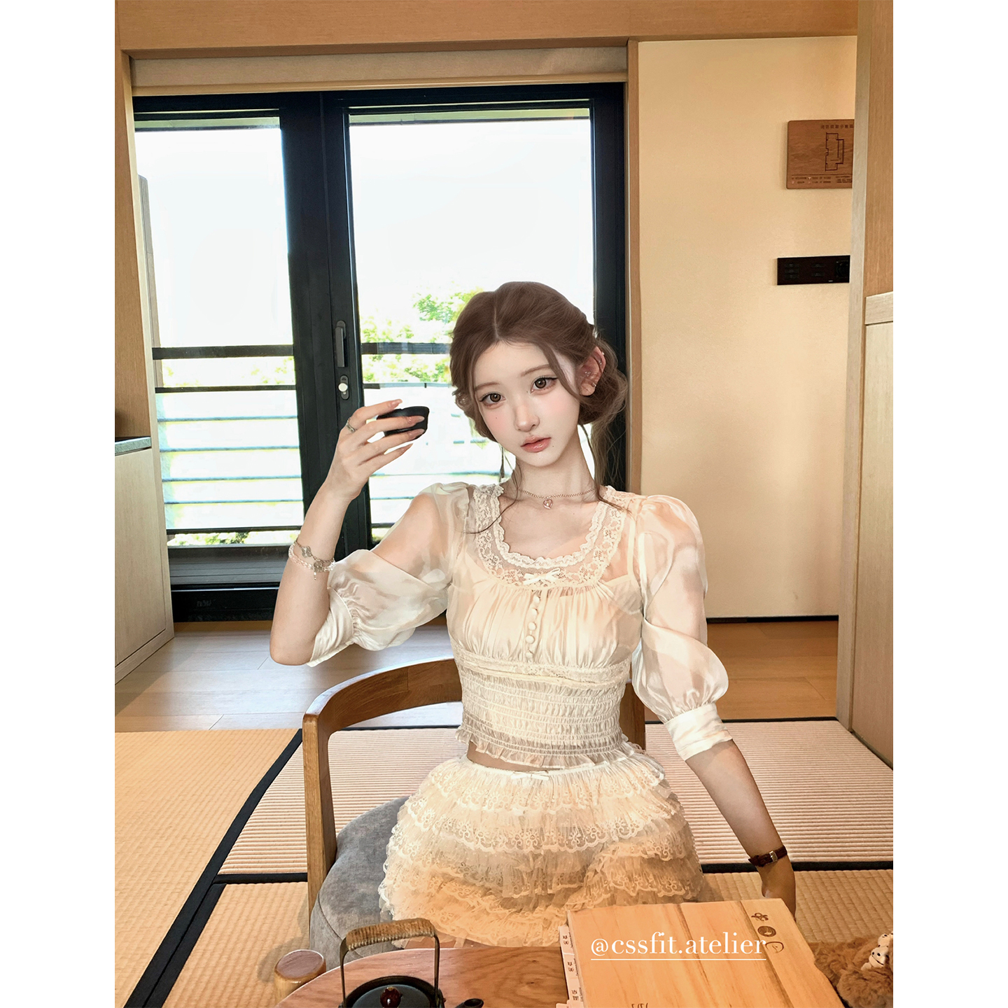 上衣 莓系奶霜 花边衬衫 两色入 打揽微透蝴蝶结泡泡袖 迟伞伞25