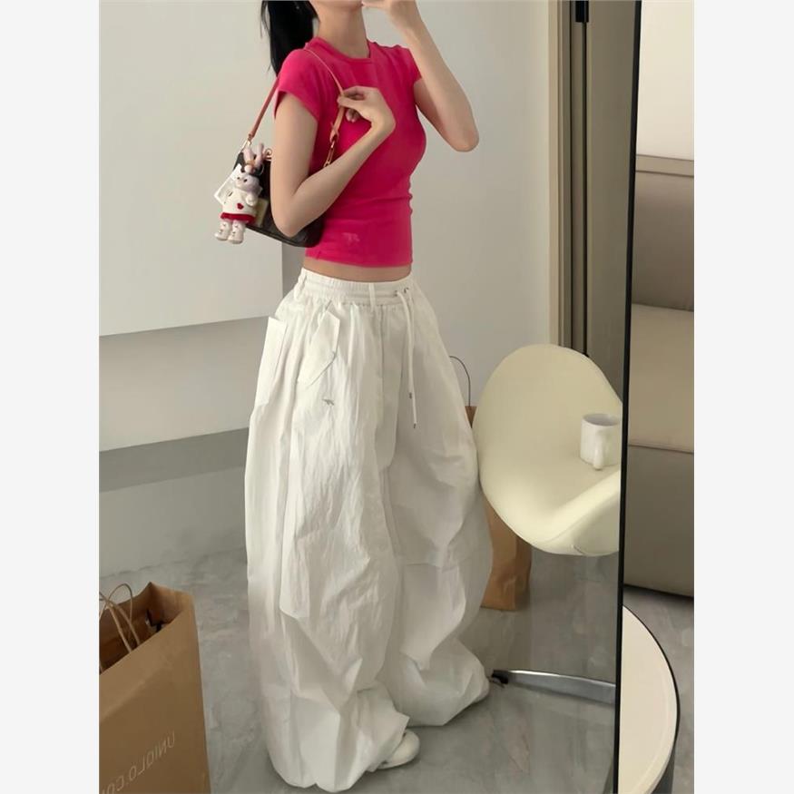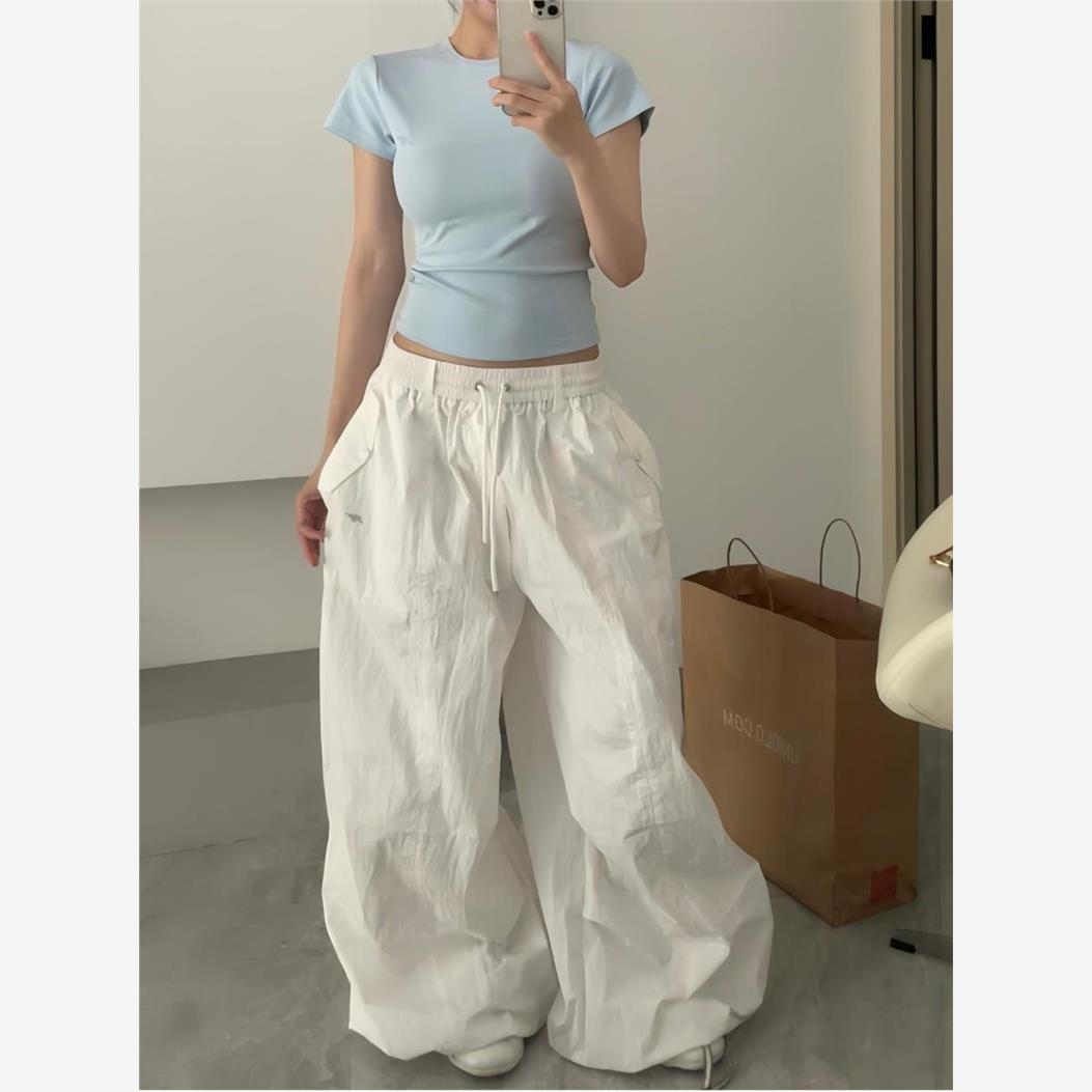 女士抽绳宽松皱褶显瘦休闲裤 秋季 长裤 复古廓形降落伞兵工装 子 美式