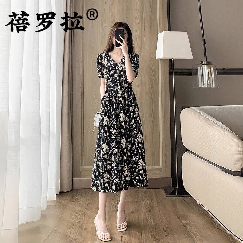 气质v领收腰a字裙子 夏季 蓓罗拉法式 雪纺碎花连衣裙女2x024新款