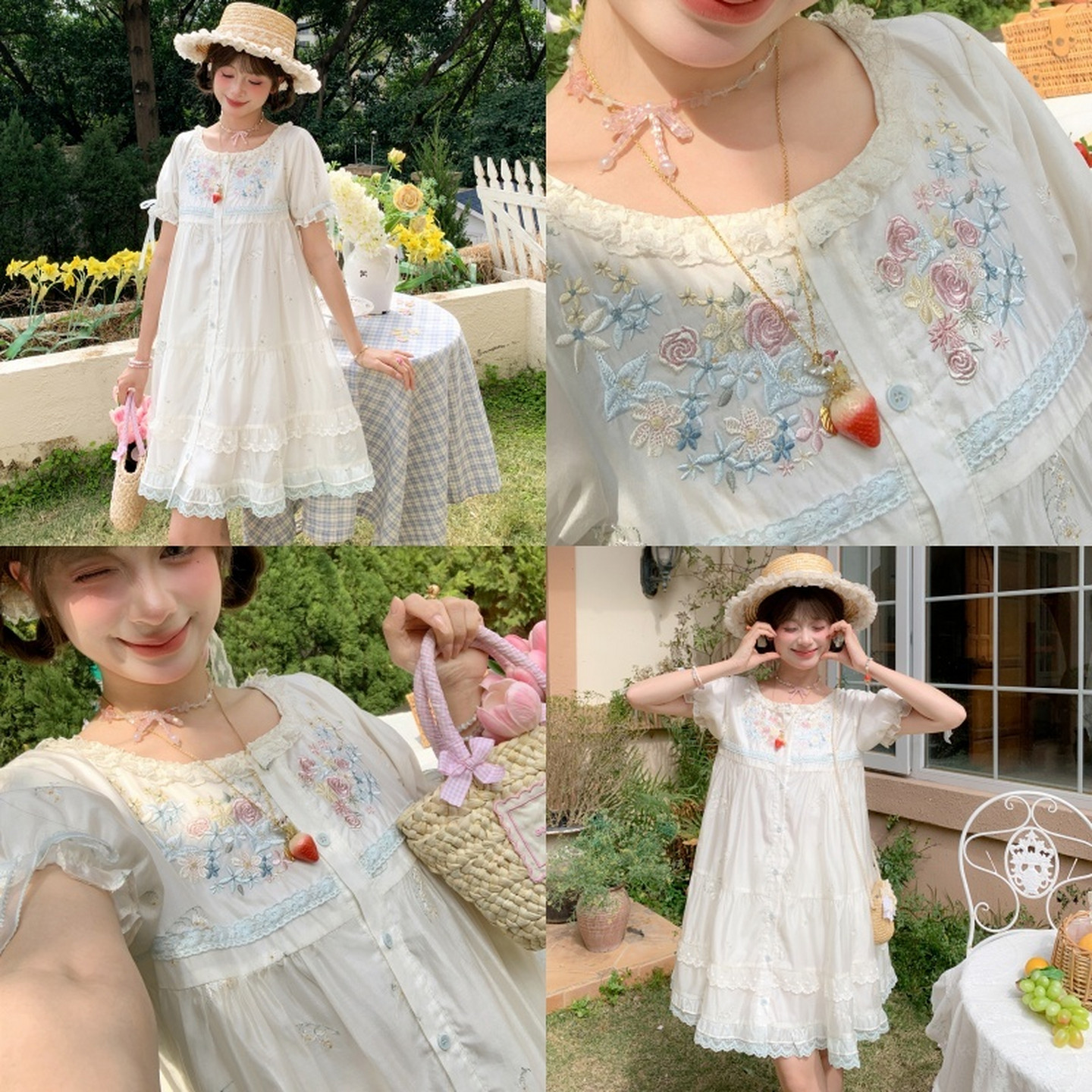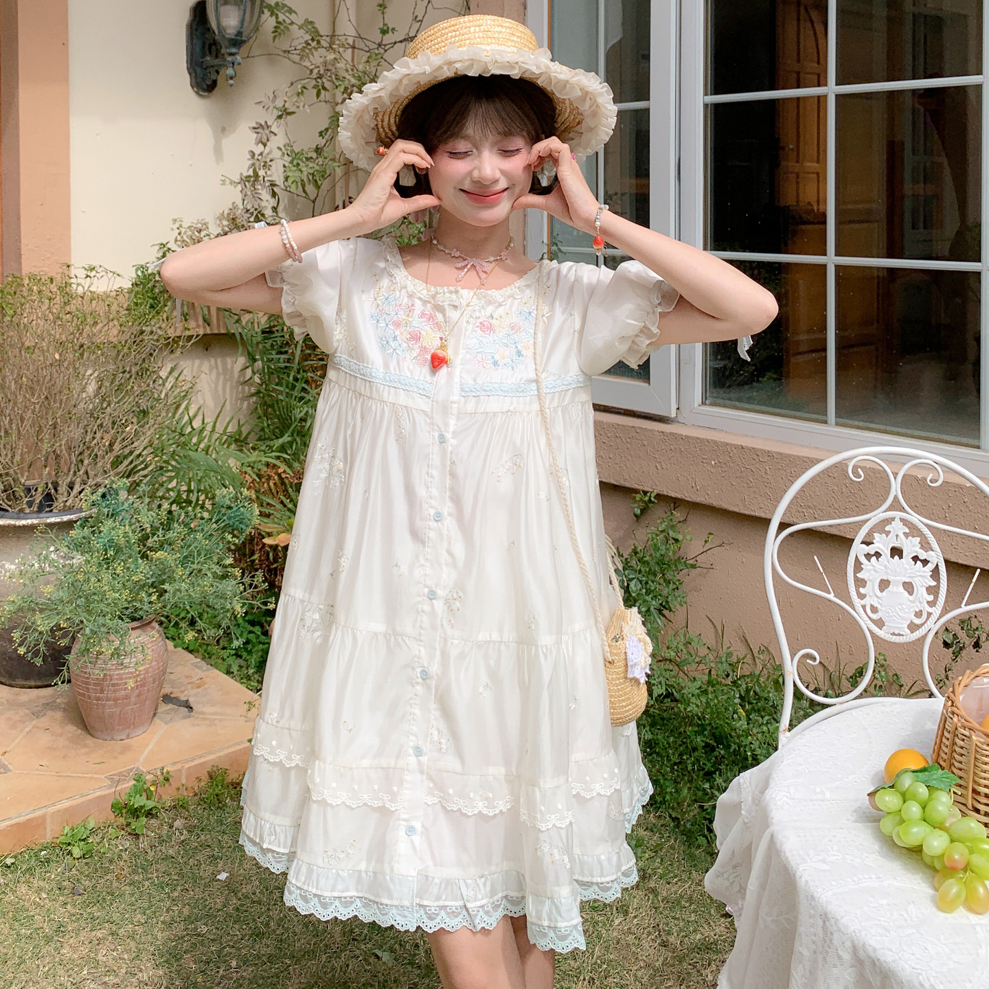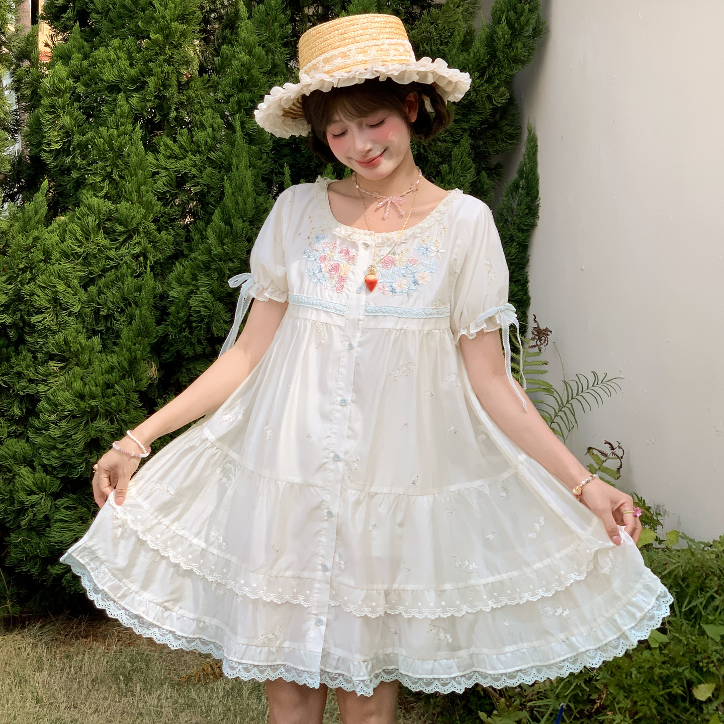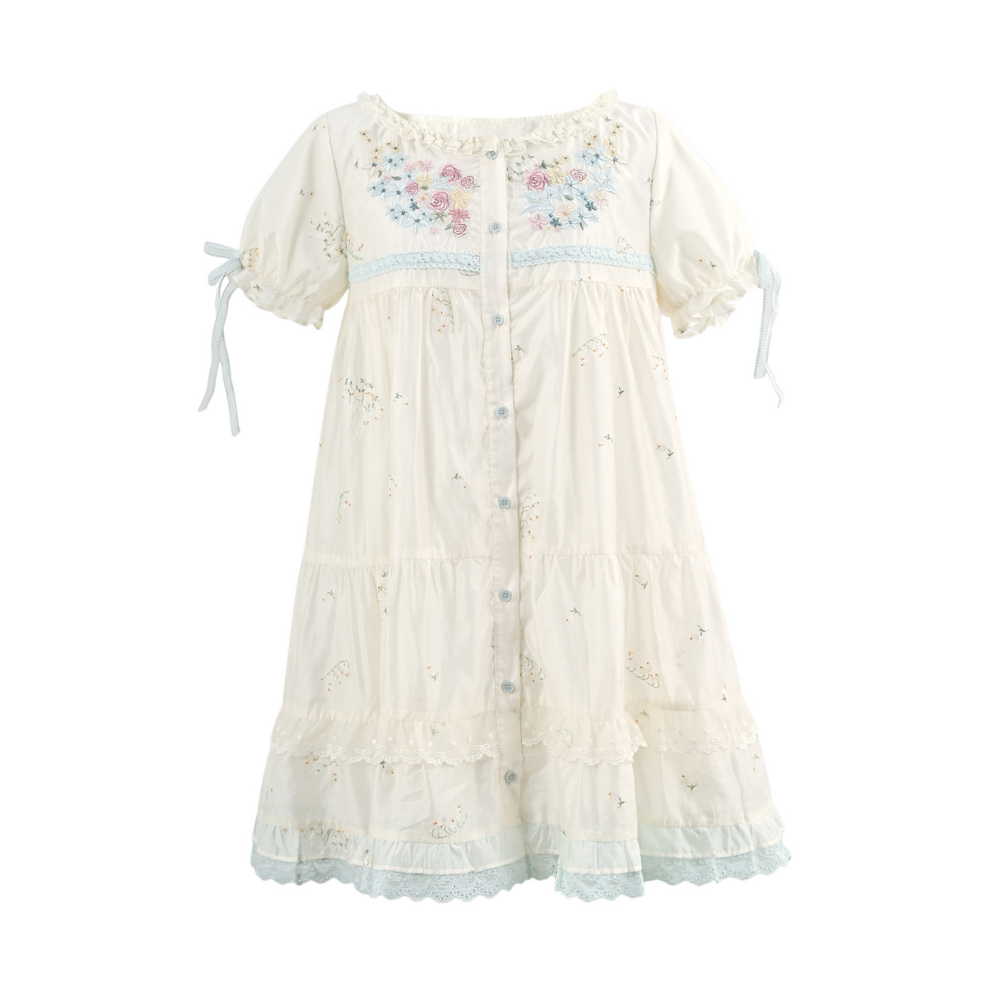 森女部落温柔花卉刺绣设计感83.7%莱赛尔泡泡袖 宽松连衣裙女新款