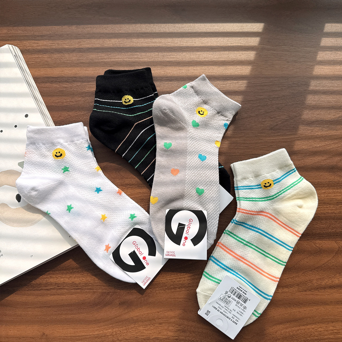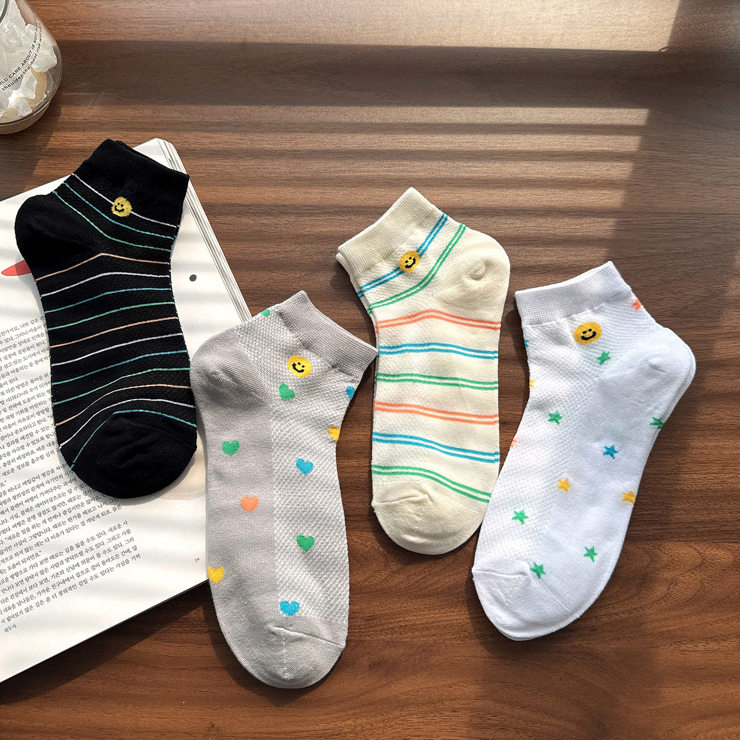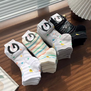 韩国东大门进口女袜子GLALALANE春夏季 薄棉网眼透气笑脸条纹短袜
