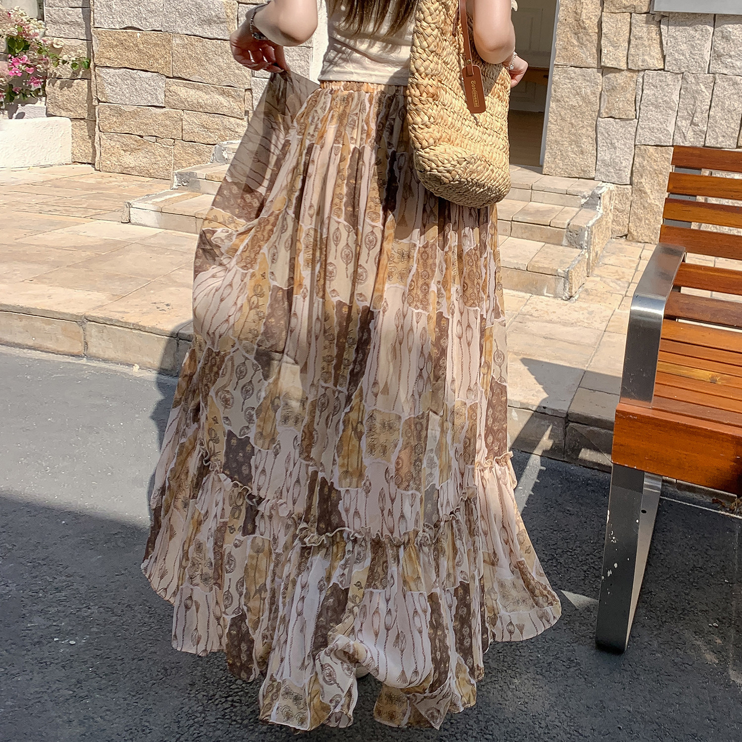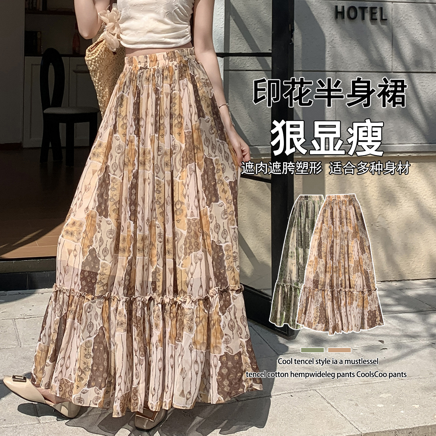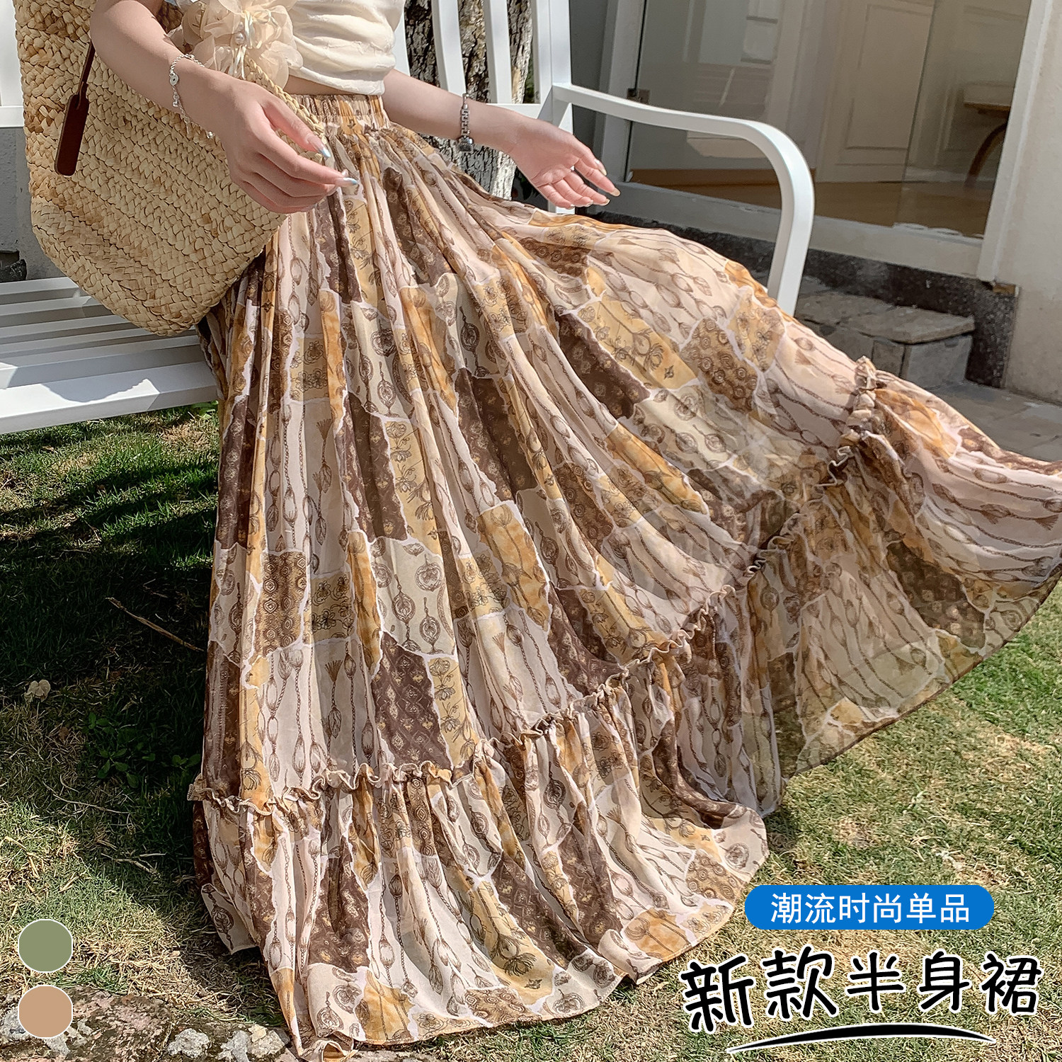 波西米亚风绿色印花A字半身裙女2026夏季 高腰显瘦大摆度假风长裙