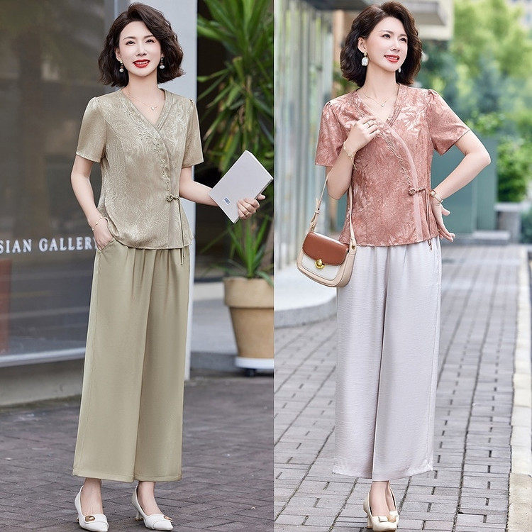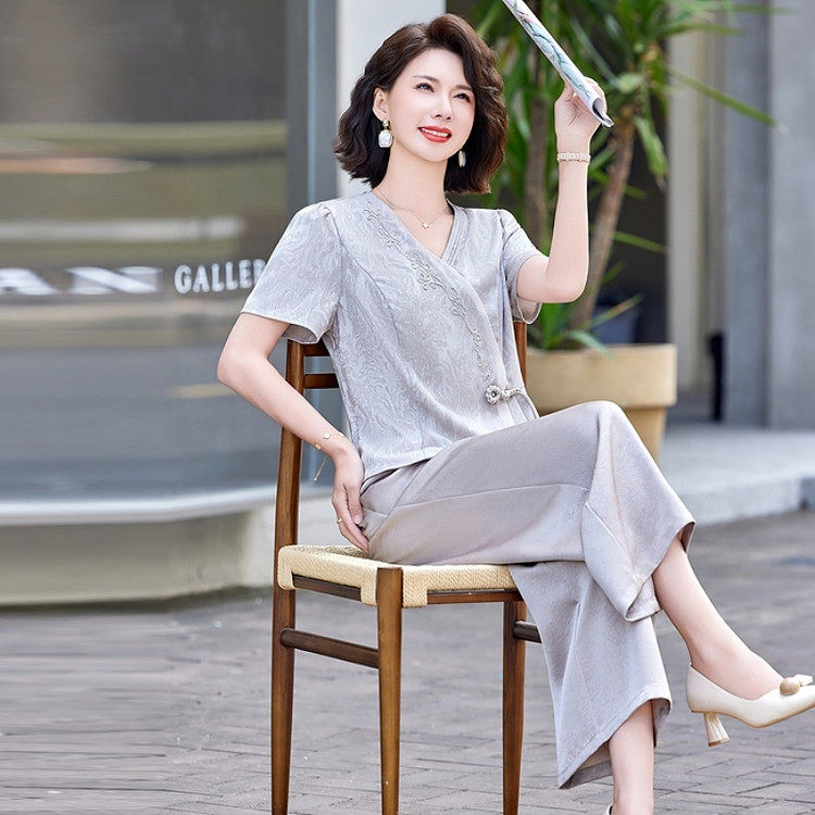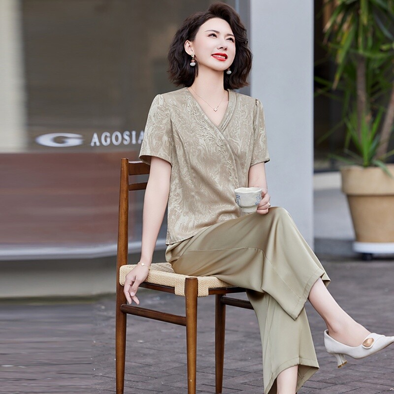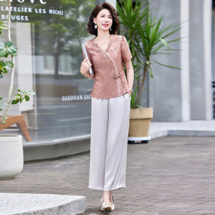 中老年女气质减龄上衣短袖 年轻妈妈夏装 新款 洋气两件套装 t恤 时尚