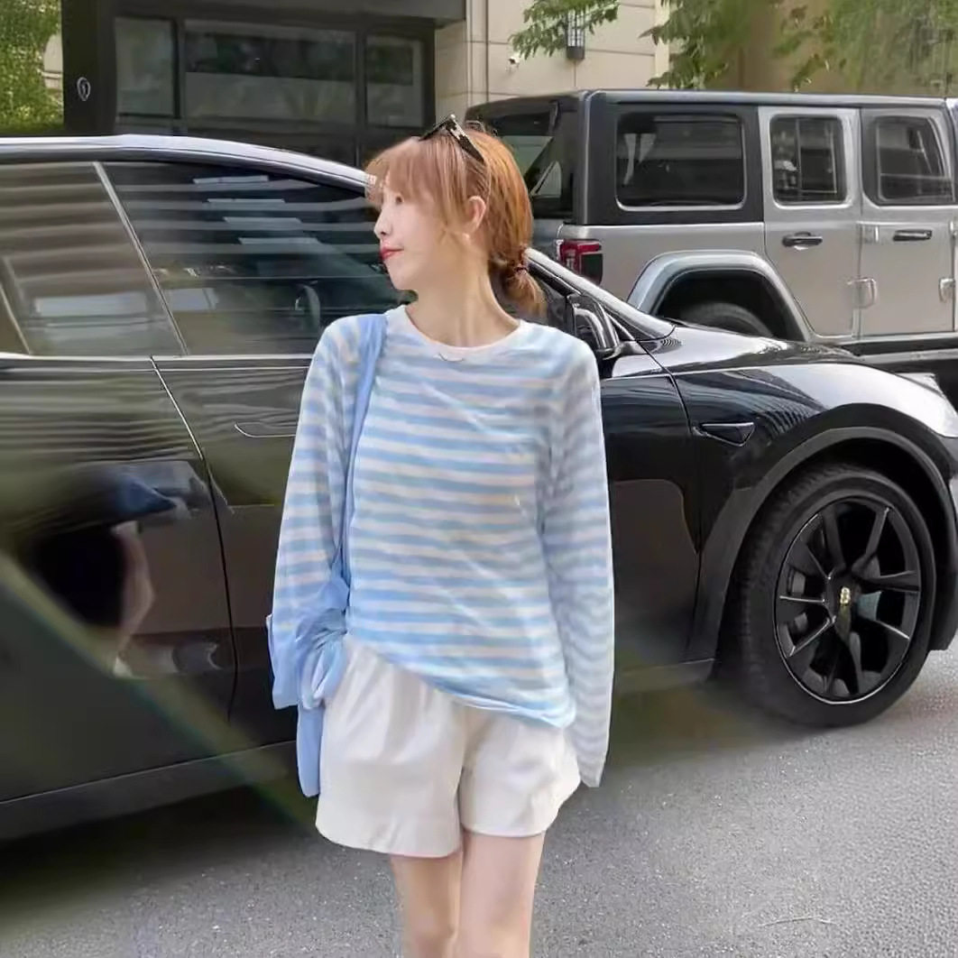 衣服休闲宽松薄款 春夏季 防晒衣 撞色透明条纹T恤女长袖 2025新款