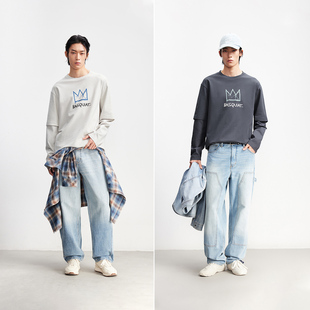 宽松长袖 春季 杰克琼斯男装 假两件T恤凉感印花上衣男士 BSQ联名