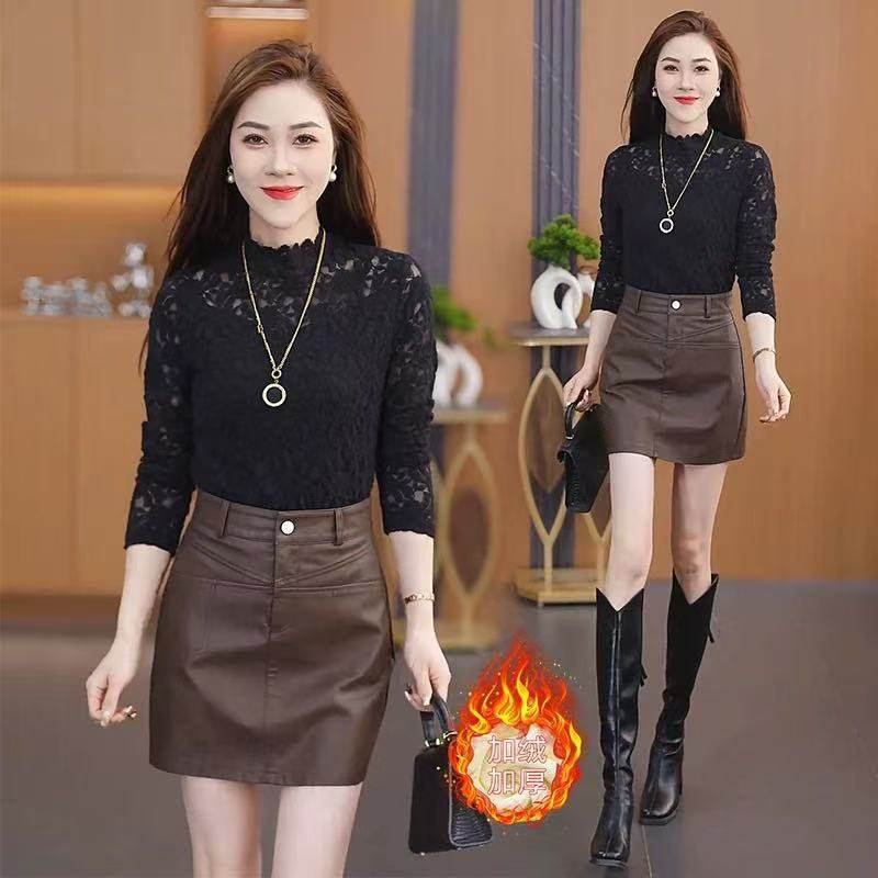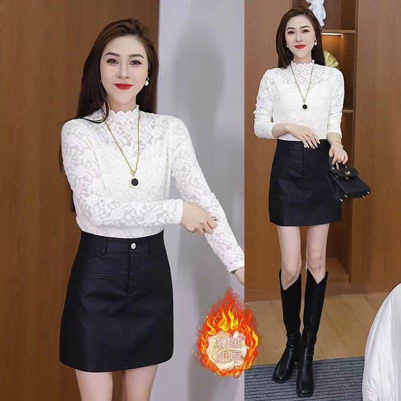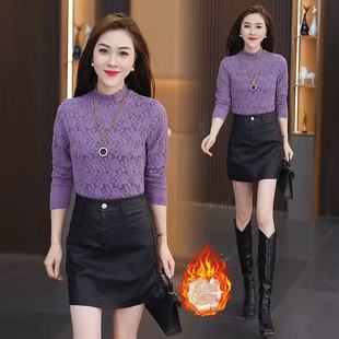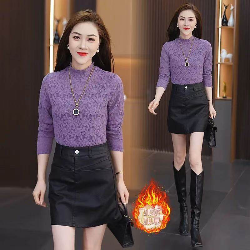洋气修身 半高领加绒蕾丝打底衫 时尚 新款 显瘦内搭上衣 女2025秋冬季