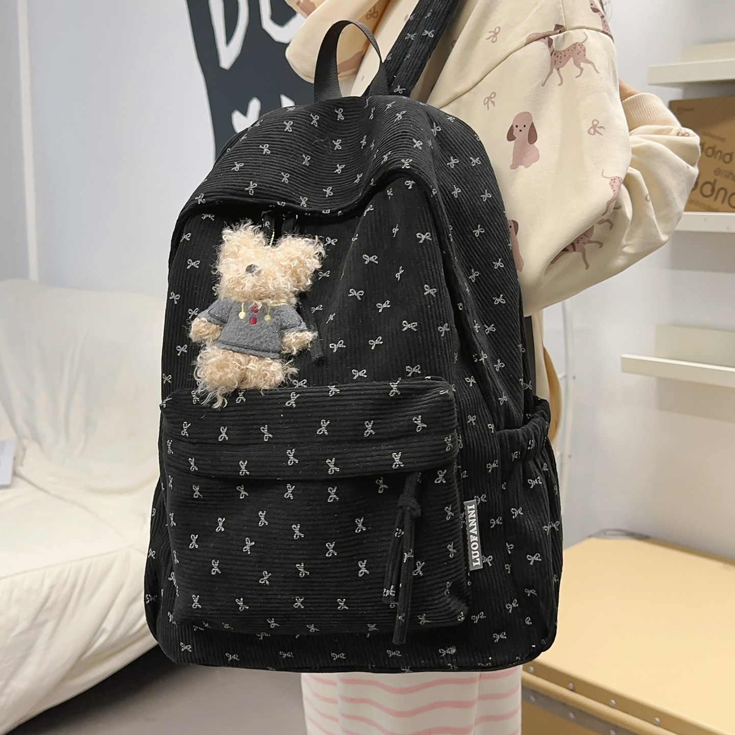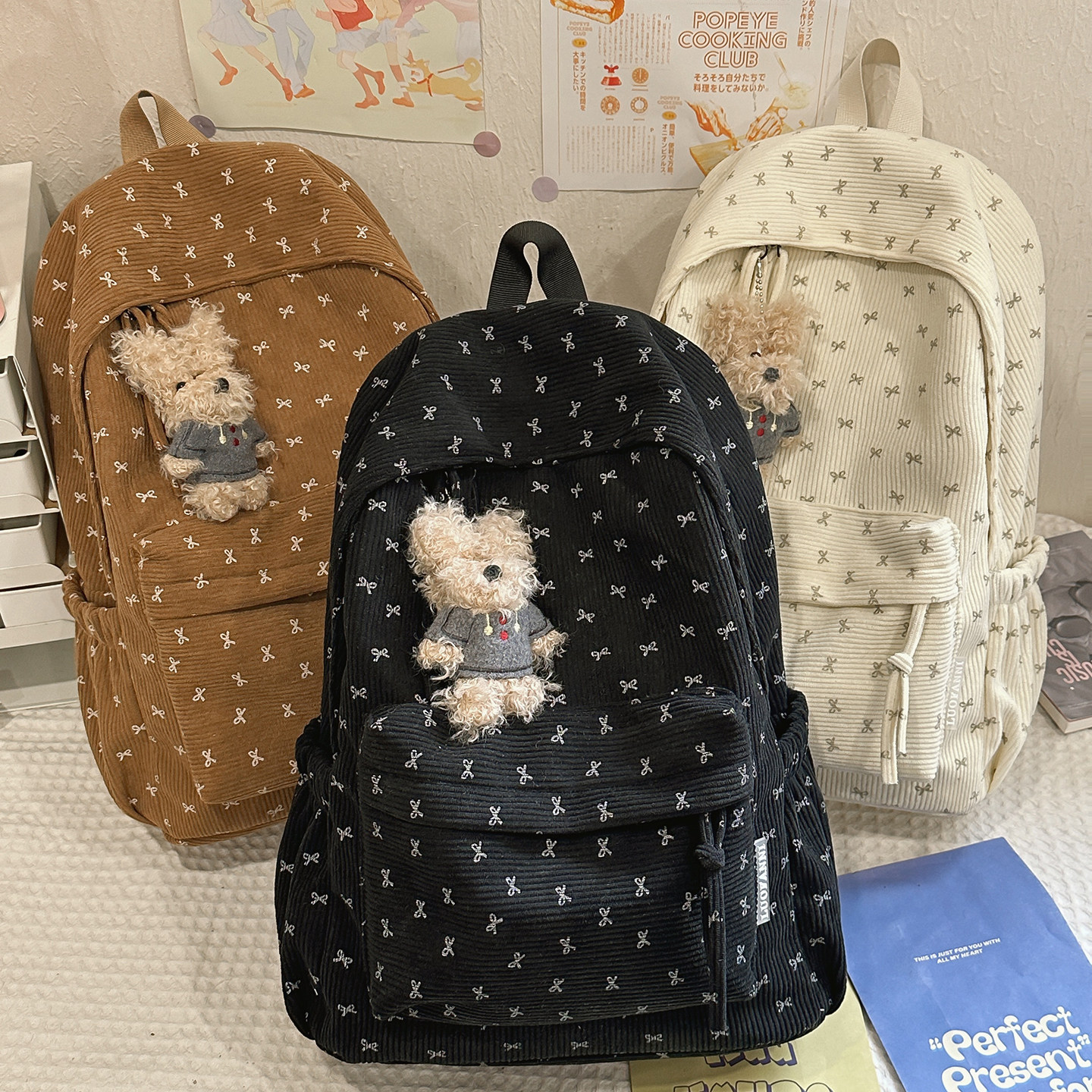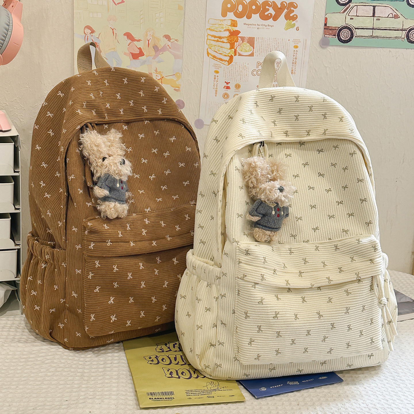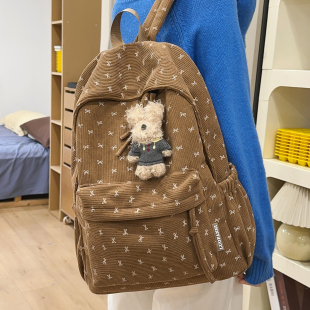 日系ins灯芯绒双肩包女小学生初中生轻便校园书包蝴蝶结少女背包