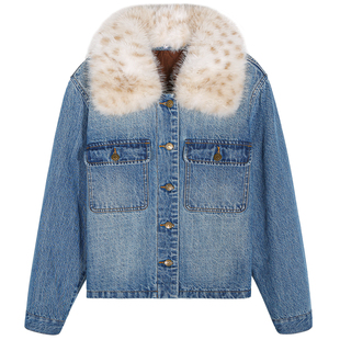 白色灰色毛呢短款 雪国千金真狐狸毛羊毛 原创设计 外套 BLUE