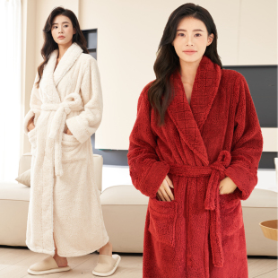 红豆居家情侣抗静电睡袍女珊瑚绒长款 睡衣加厚法兰绒居家服浴袍男