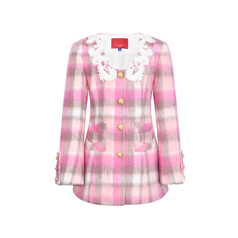 lefame拉飞姆海马毛收腰中长款 粉彩格纹外套