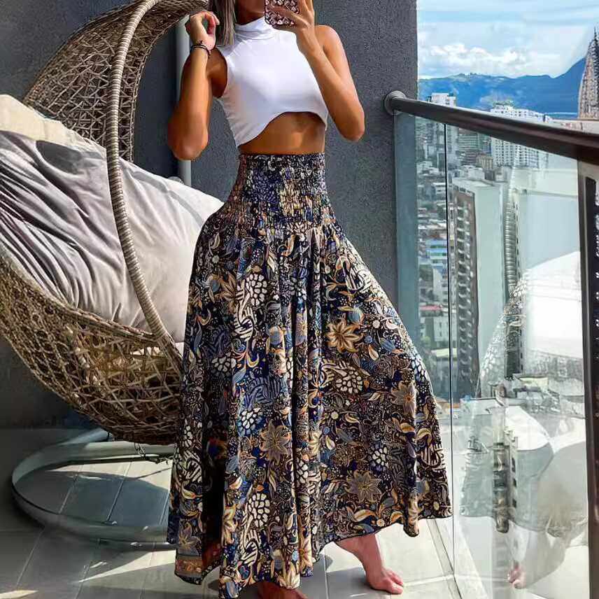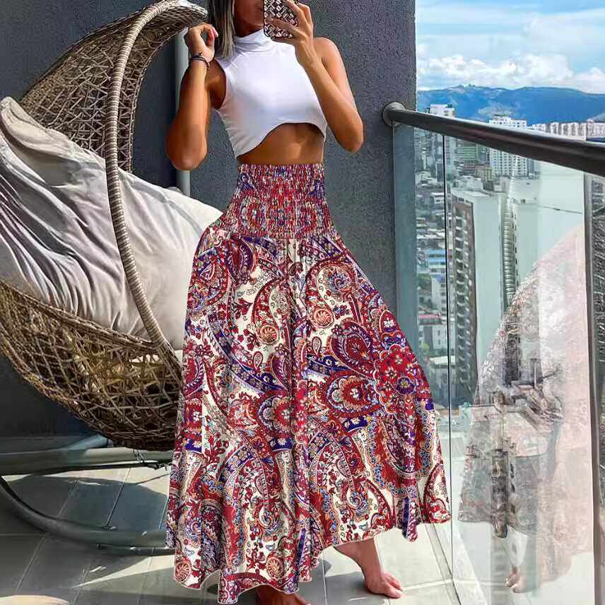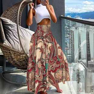 欧美海边度假沙滩半身裙复古印花波西米亚松紧高腰半身长裙女夏