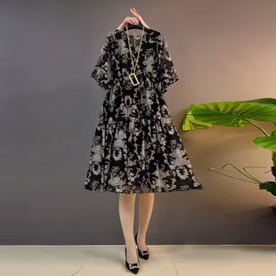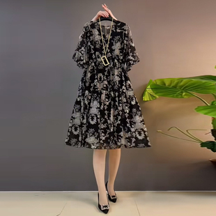 女装 中长款 V领短袖 2024新款 显瘦休闲裙 碎花连衣裙胖妹妹法式 大码