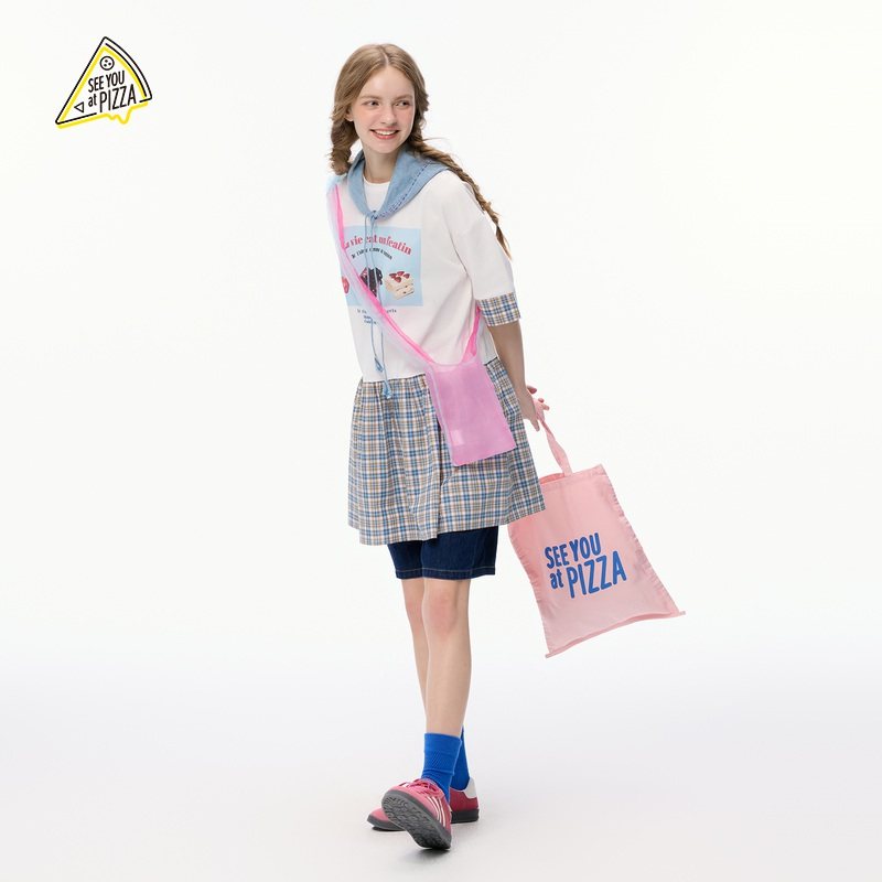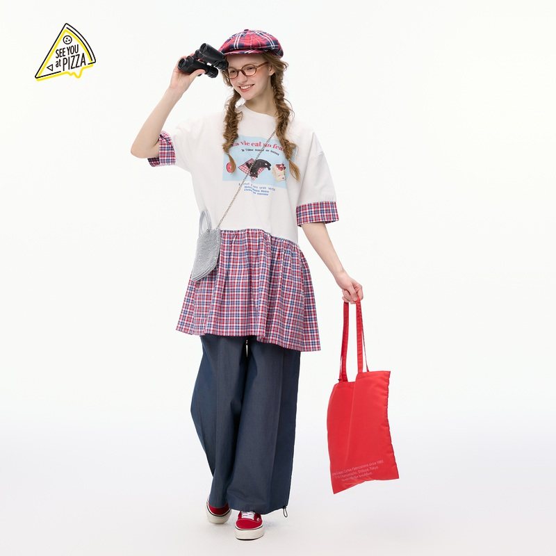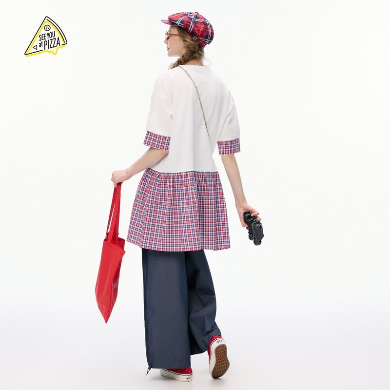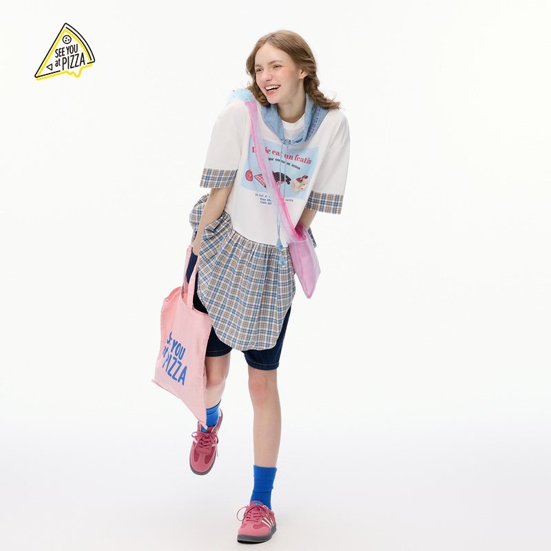 YOU 新款 T恤女2025夏季 格纹拼接印花休闲T恤494830 PIZZA SEE