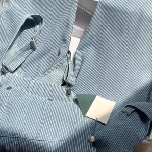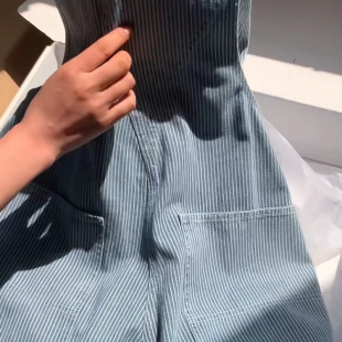 女2026早春韩系重磅休闲高腰连体裤 现货 复古蓝色条纹牛仔背带裤