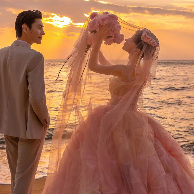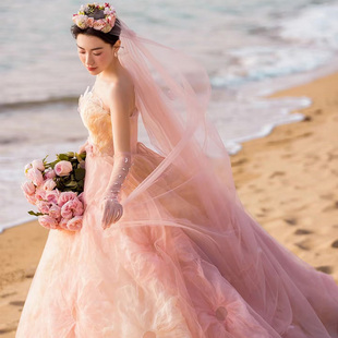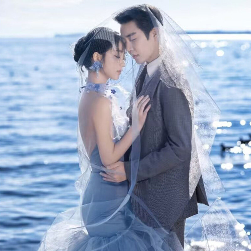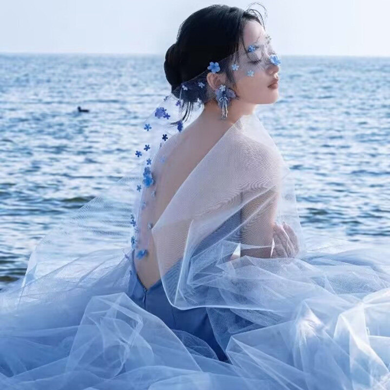 新娘粉色头纱长款 紫色拖尾婚纱摄影拍照道具结婚森系头饰造型蓝色