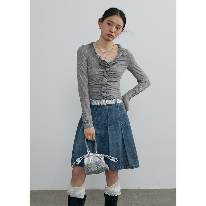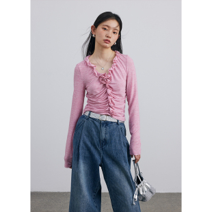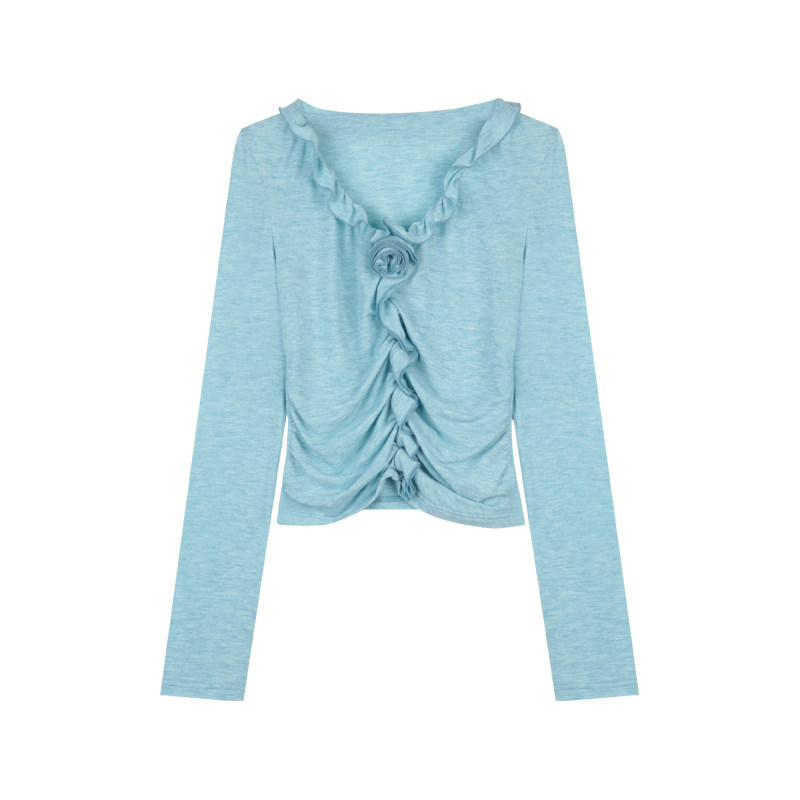 夏季 BLUEerror 显瘦打底衫 t恤女修身 手工立体玫瑰花v领荷叶边长袖