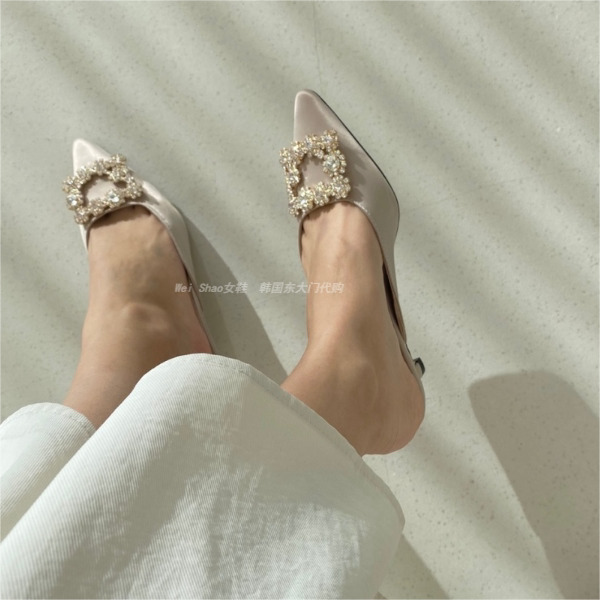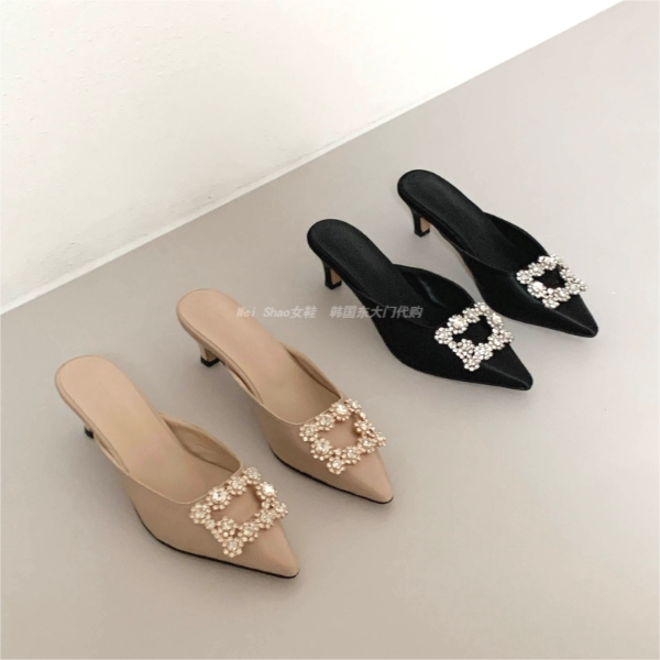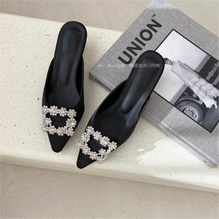 韩国东大门代购 女 25春夏气质仙女风尖头方扣水钻缎面细跟包头拖鞋