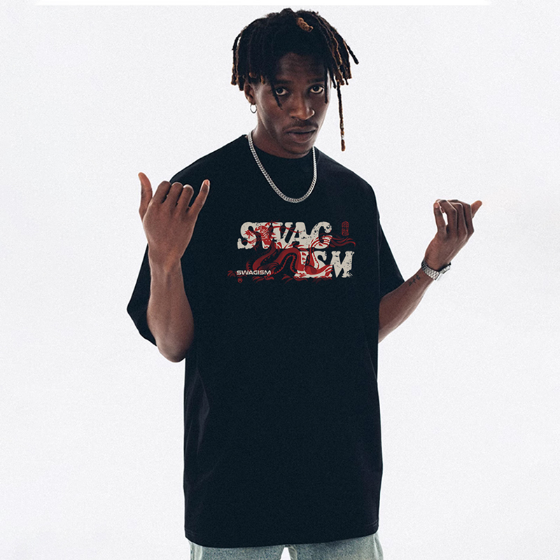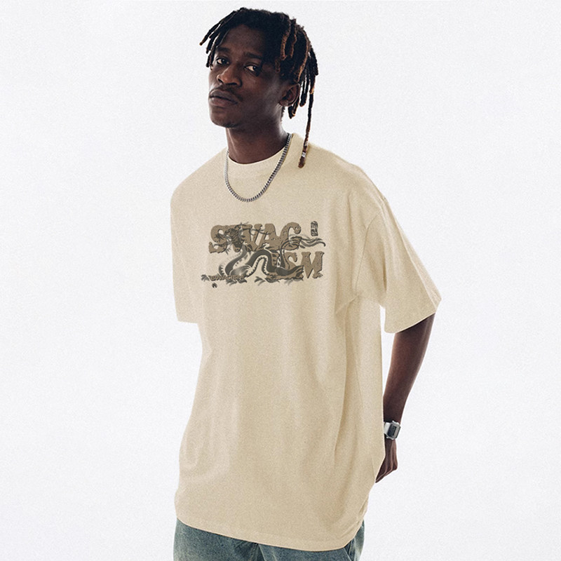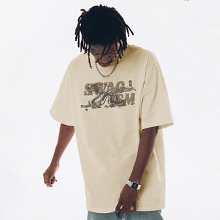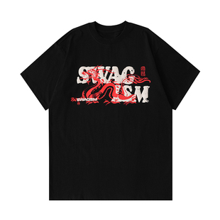 黑色白色男生半袖 国潮重磅纯棉情侣装 t恤 宽松夏季 STA叠印龙纹短袖