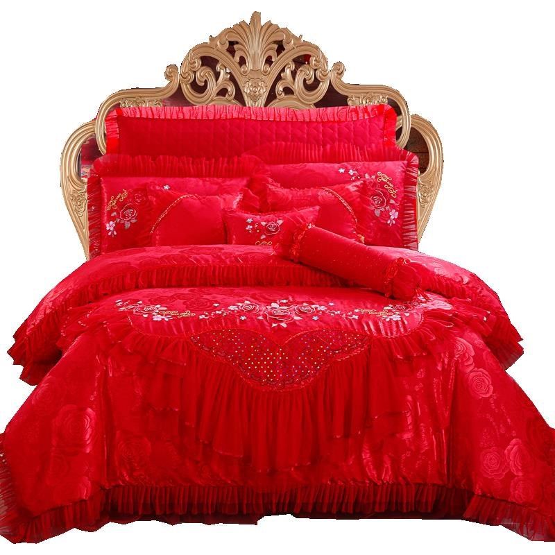 高档结婚庆大红色纯棉全棉蕾丝床裙床盖罩床单1.5m1.8m2米四件套