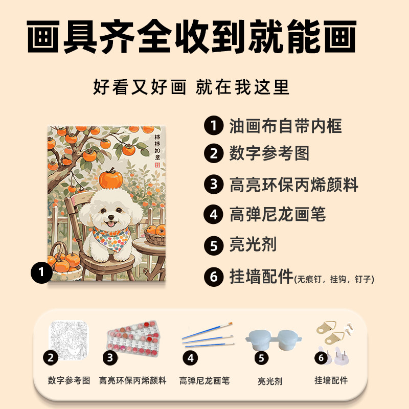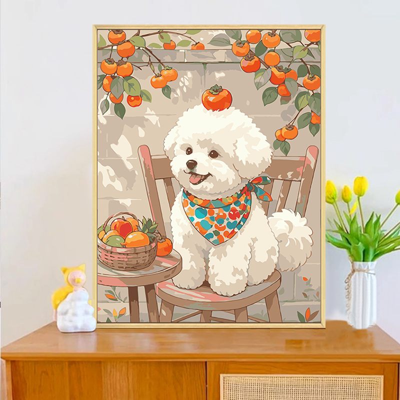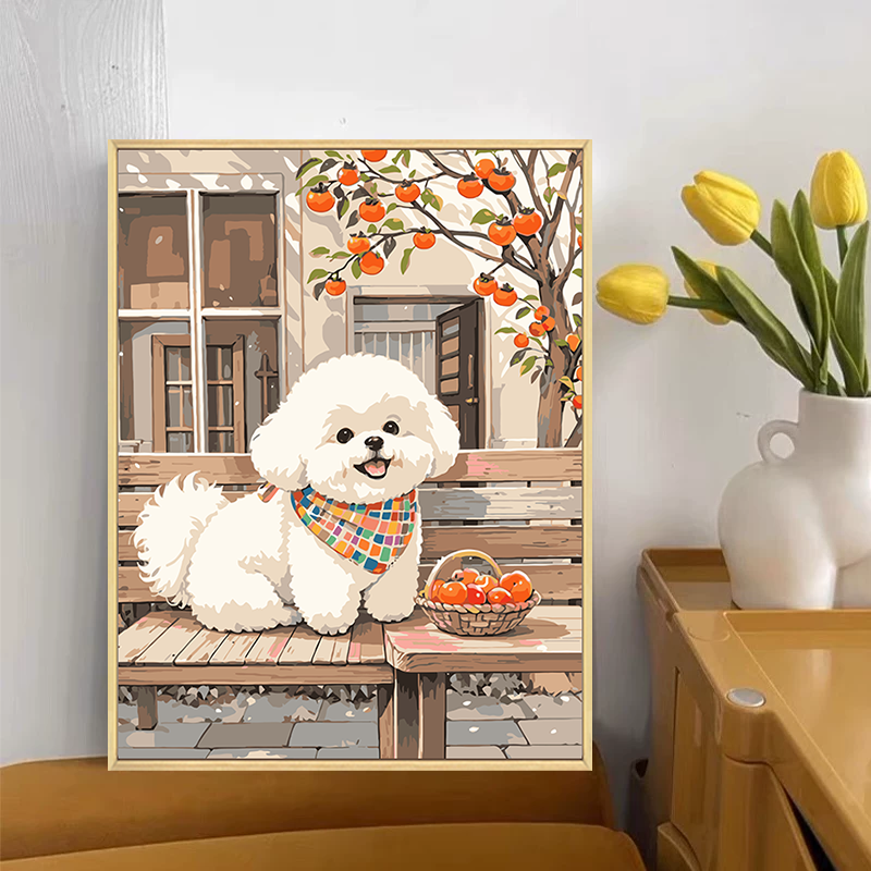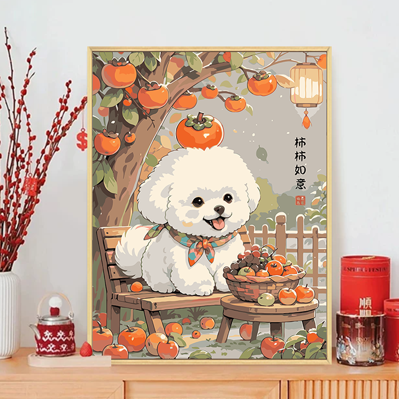 可爱比熊数字油画diy填充填色手工绘柿柿如意狗狗丙烯画装 饰挂画