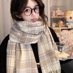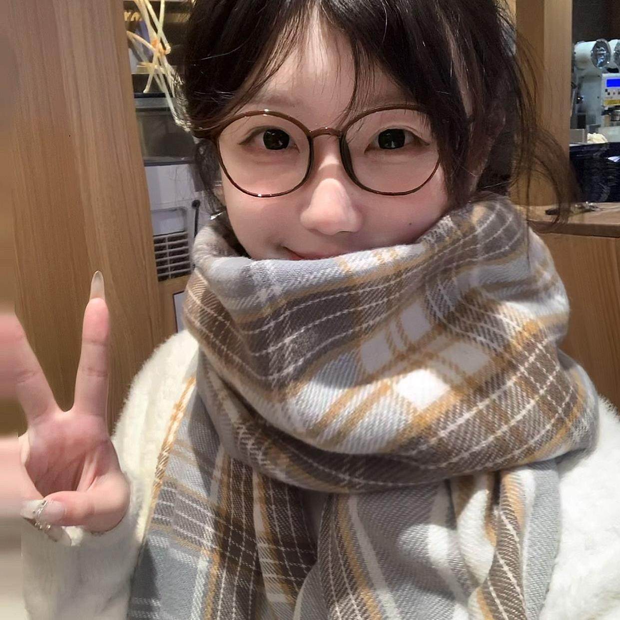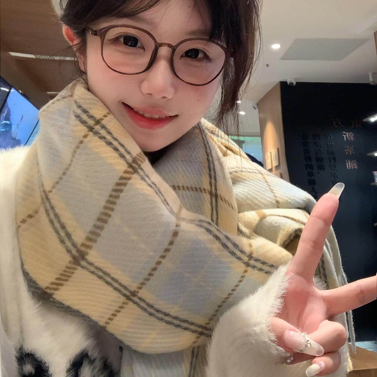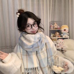 蓝色高级感格子围巾冬季 百搭韩系氛围感围脖加厚两用 女披肩新款