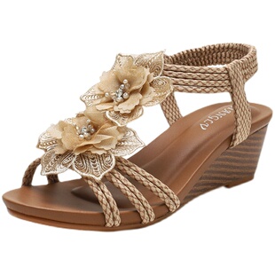 露趾女鞋 女士坡跟罗马鞋 大码 波西米亚复古花朵度假凉鞋 夏2026新款