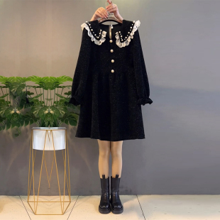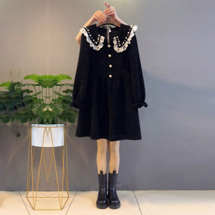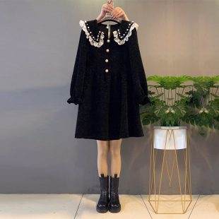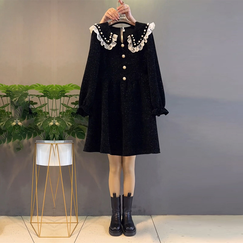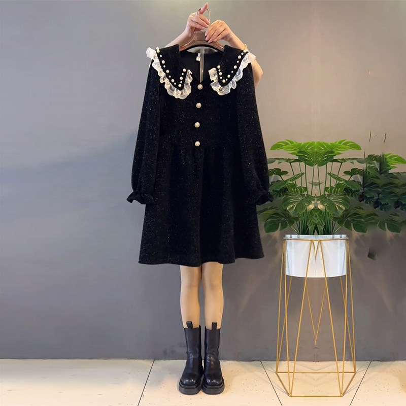 加肥娃娃领钉珠蕾丝荷叶边连衣裙胖MM大码 小香风显瘦遮肉裙子 女装