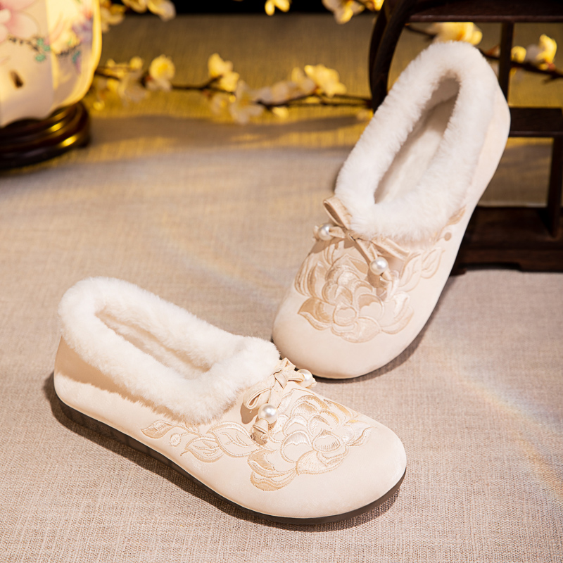 一脚蹬厚底绣花鞋 女加绒加厚保暖妈妈鞋 老北京棉鞋 2025绵羊毛冬季