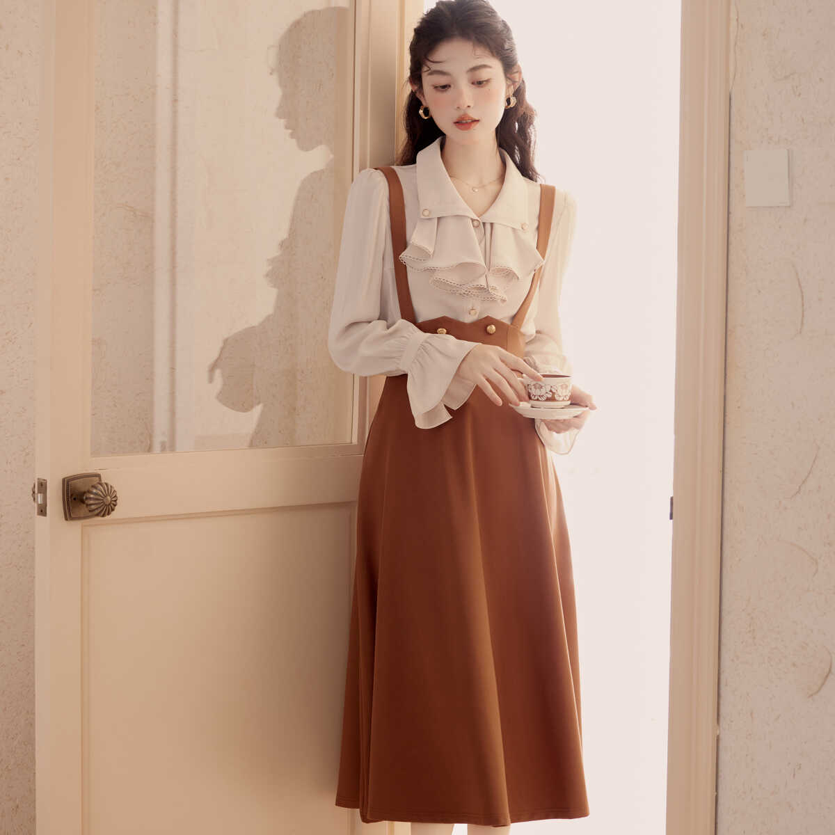 学院背带裙两件套装 苏浅慕颜春秋季 复古宫廷衬衫 法式 连衣裙女 新款