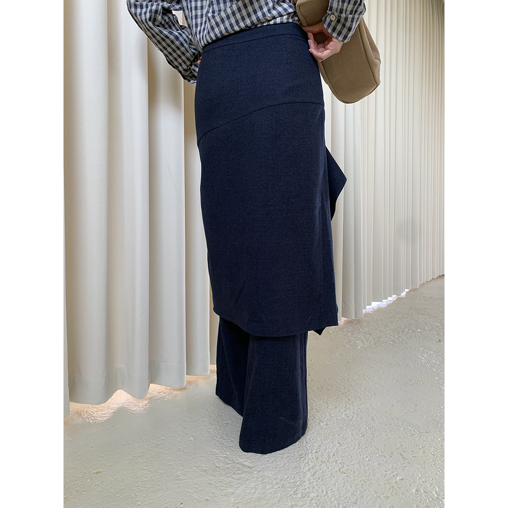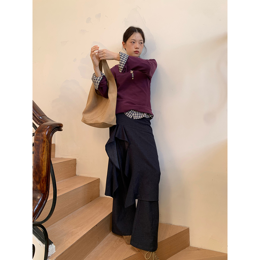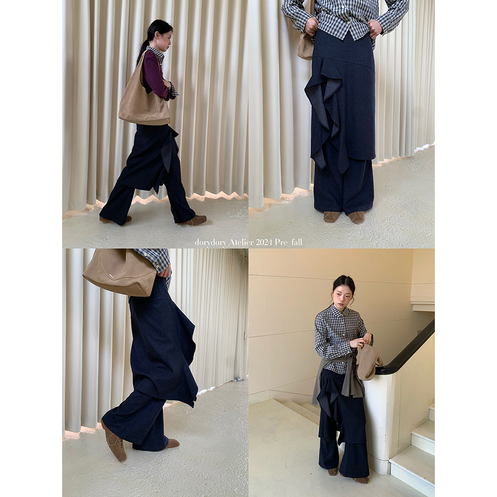 慵懒松弛感裤 阔腿喇叭裤 子 休闲裤 dorydory牛仔色垂坠感荷叶边裙裤