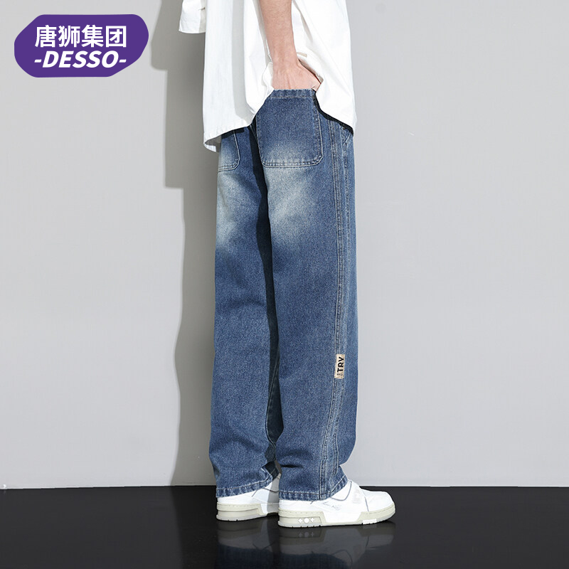 男士 直筒长裤 春夏季 高街潮牌休闲阔腿裤 子 加绒美式 黄泥松紧牛仔裤