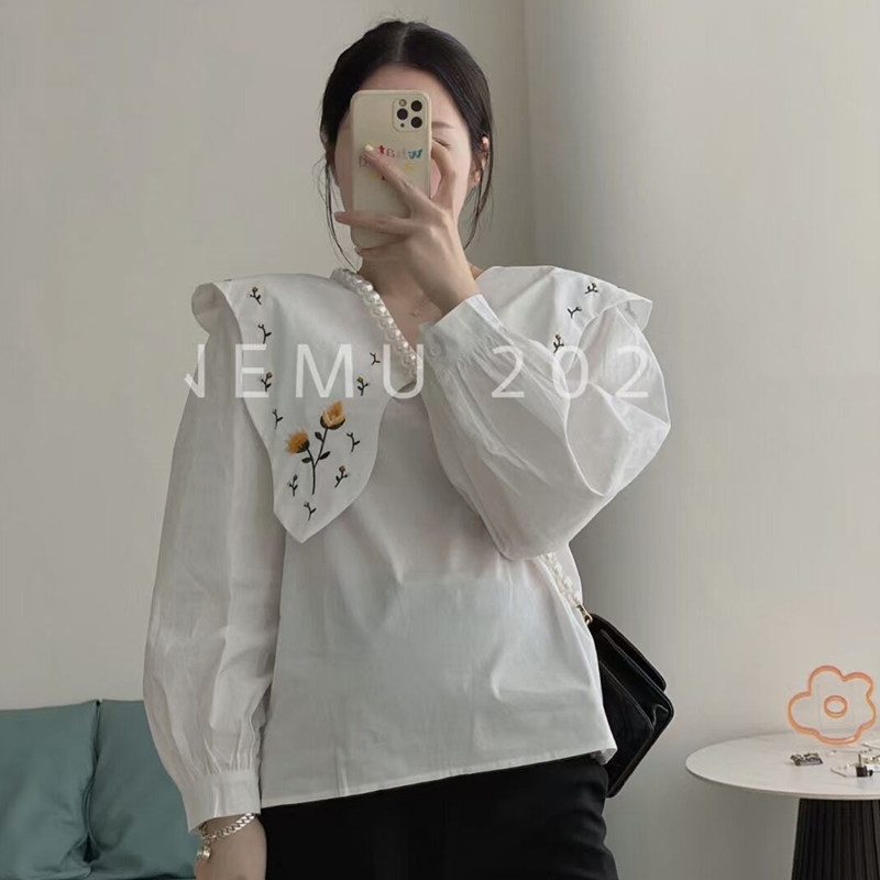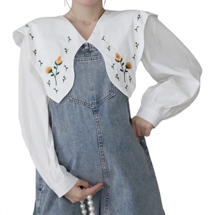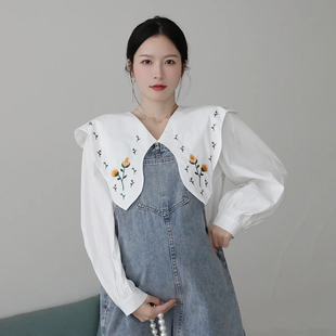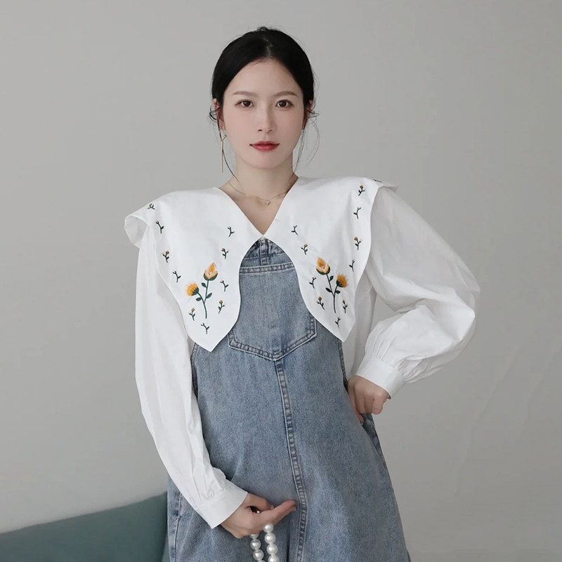减龄百搭背带裙两件套娃娃衫 气质大翻领刺绣衬衫 春秋法式 孕妇装