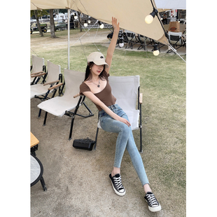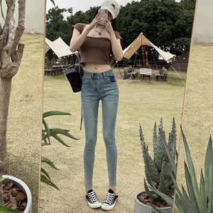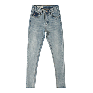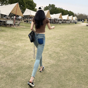 沐沐家做旧浅蓝小脚牛仔裤 秋冬加绒九分中腰提臀设计撞色 女紧身裤