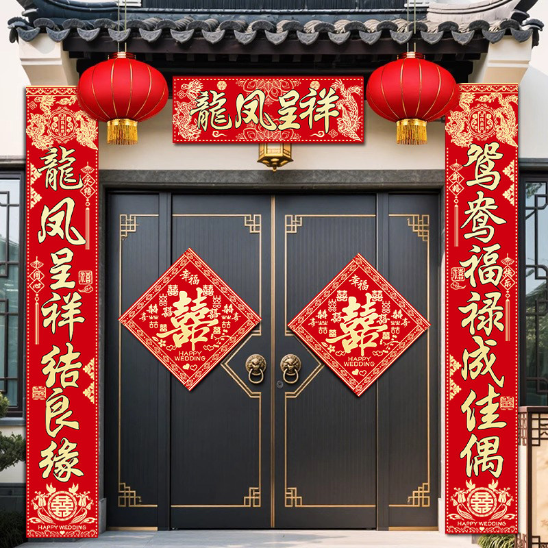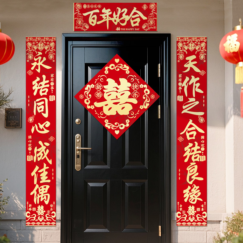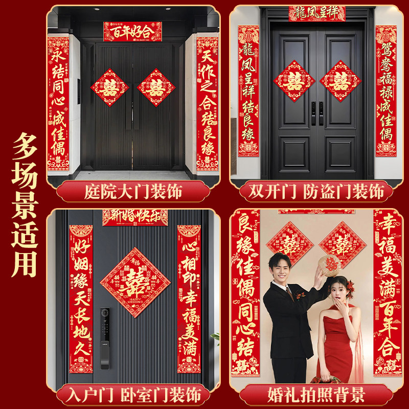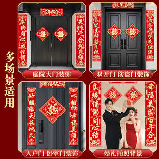 绒布结婚对联男方大门喜字贴装 饰喜联全套婚庆女方出嫁新婚房门联
