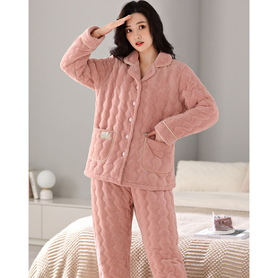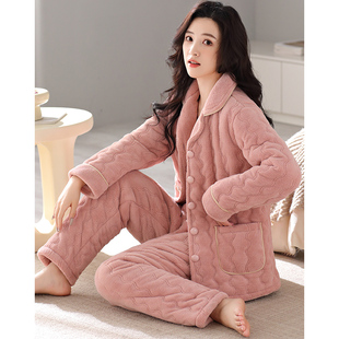 秋冬季 家居服 珊瑚绒夹棉睡衣女士加厚加绒保暖三层法兰绒棉袄新款