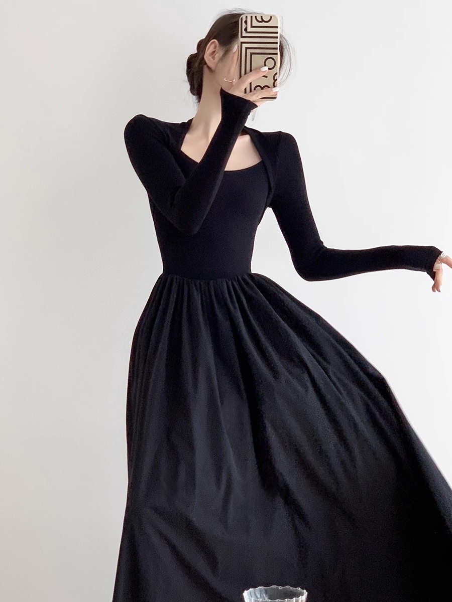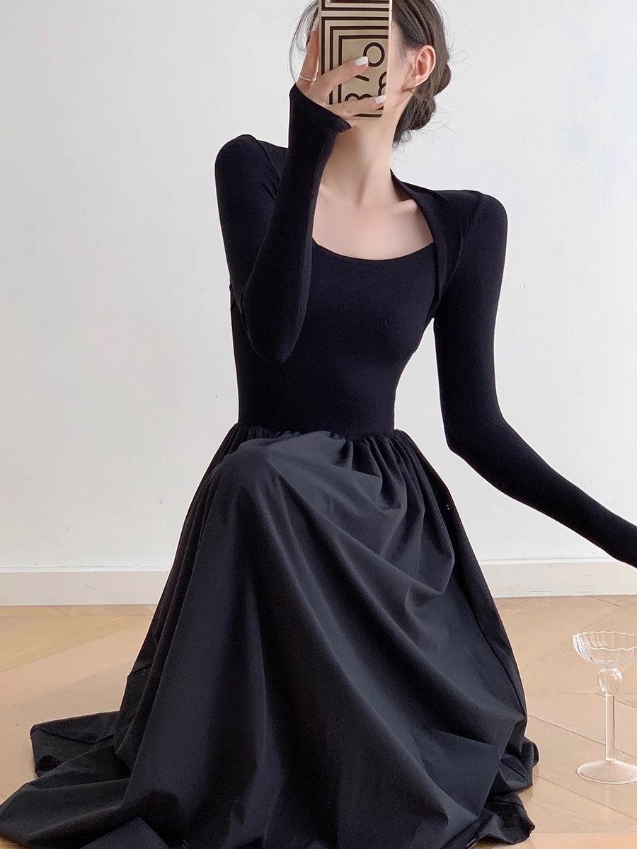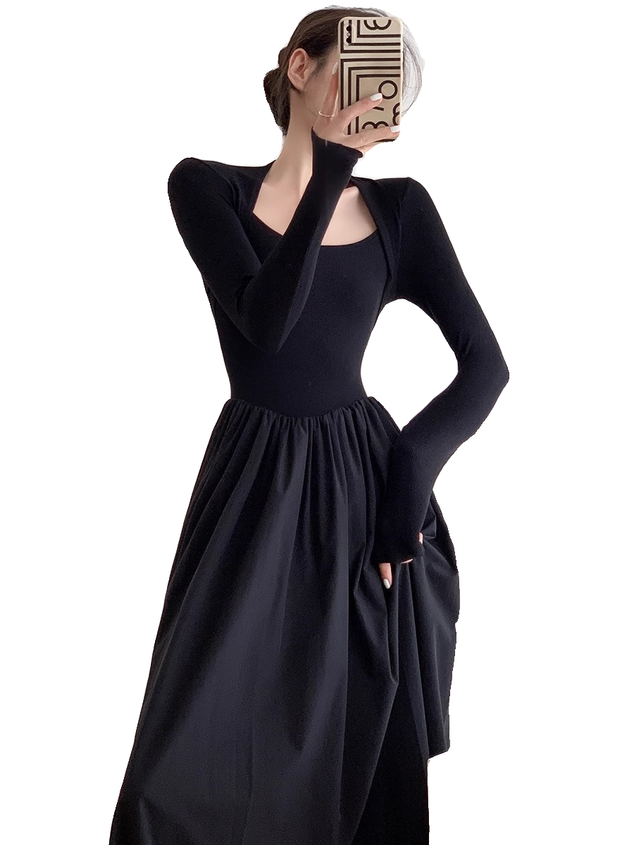 方领针织长款 修身 长裙 气质长袖 赫本风黑色连衣裙高级感秋冬法式