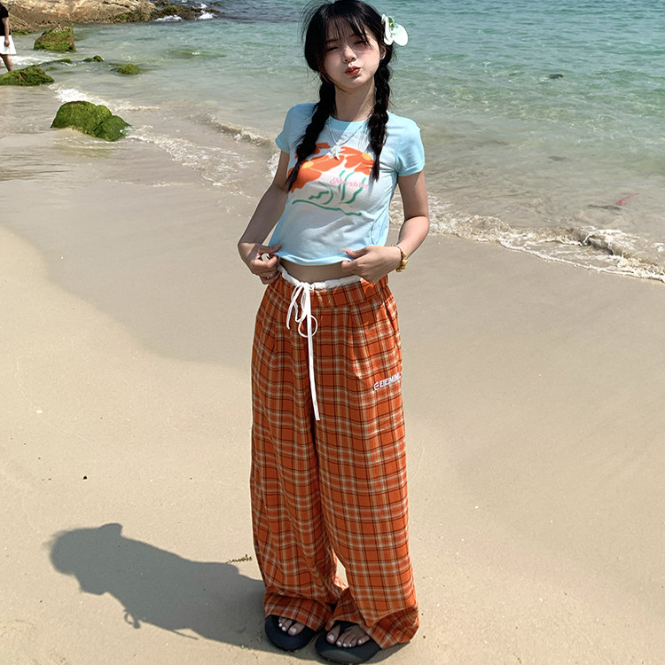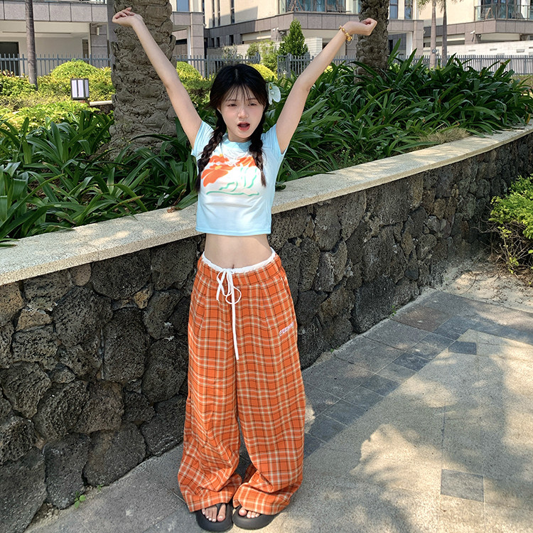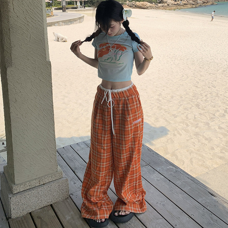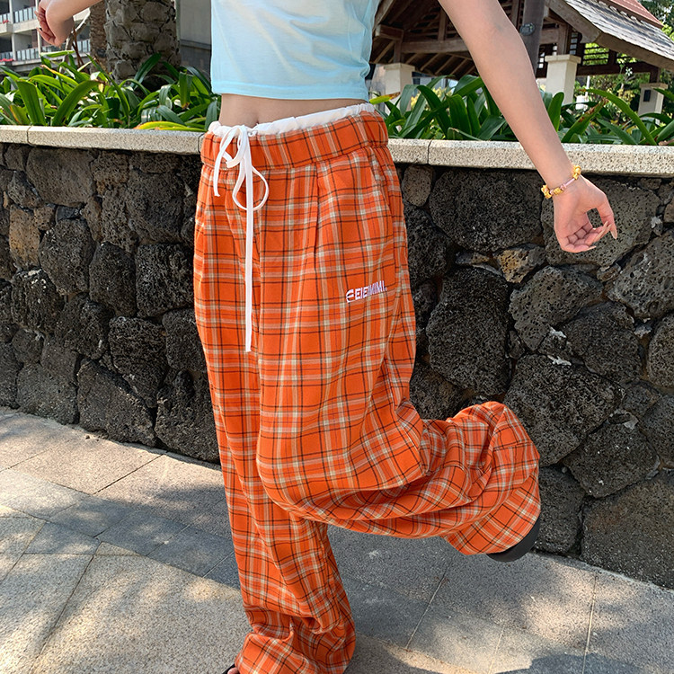 夏季 沙滩裤 复古格子橙色休闲裤 百搭设计感薄款 潮 男女新款 GTGA美式