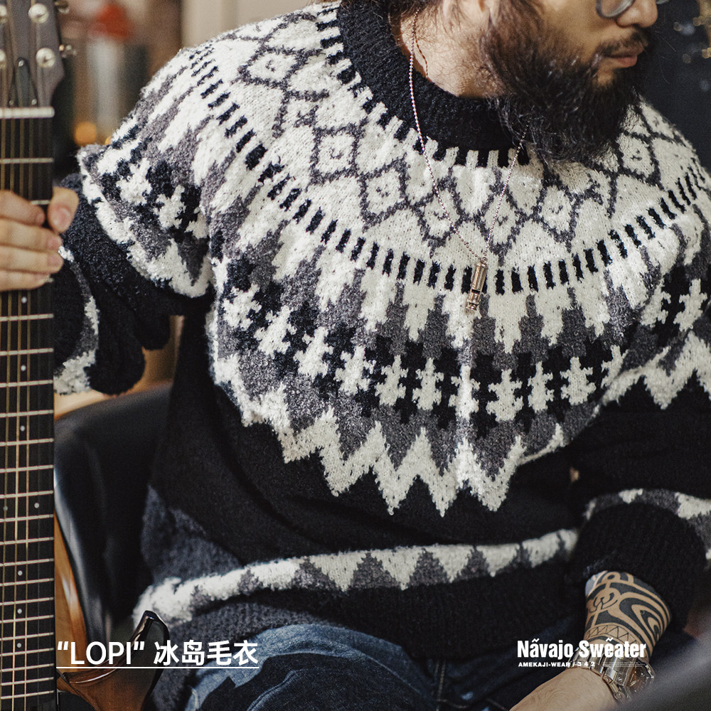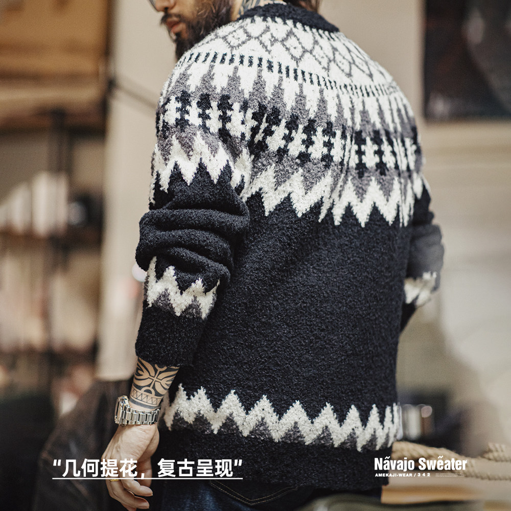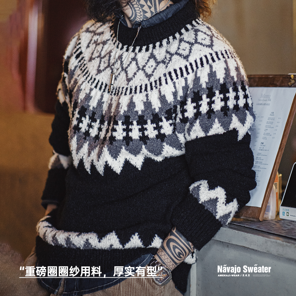 男秋 复古重磅冰岛毛衣圆领费尔岛提花打底针织衫 马登工装 美式
