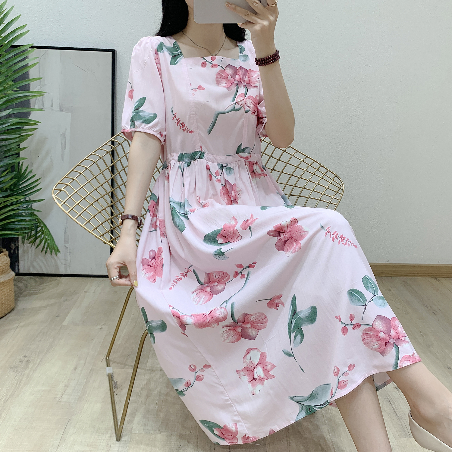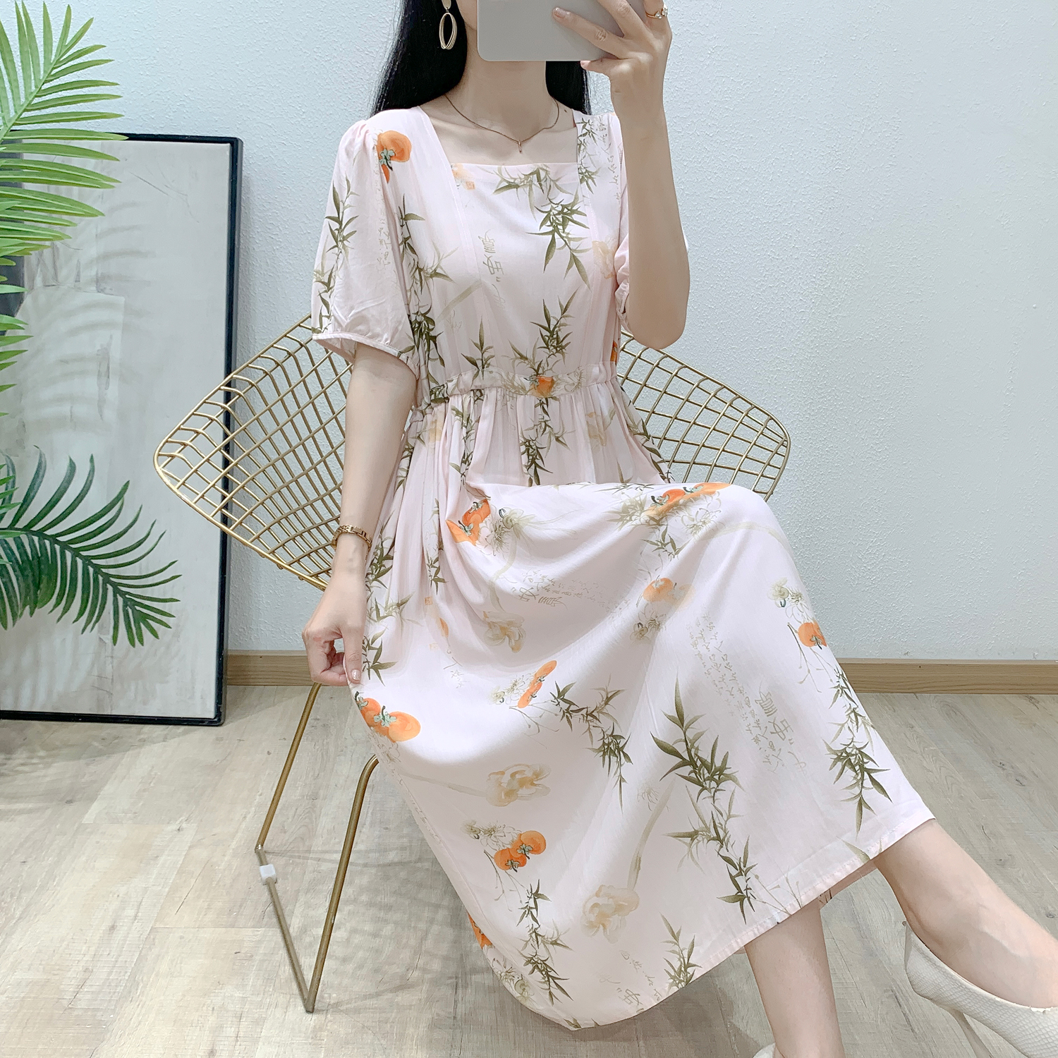 人造棉碎花大摆高腰长裙子 2025夏季 女士棉绸连衣裙新款 外穿年轻款