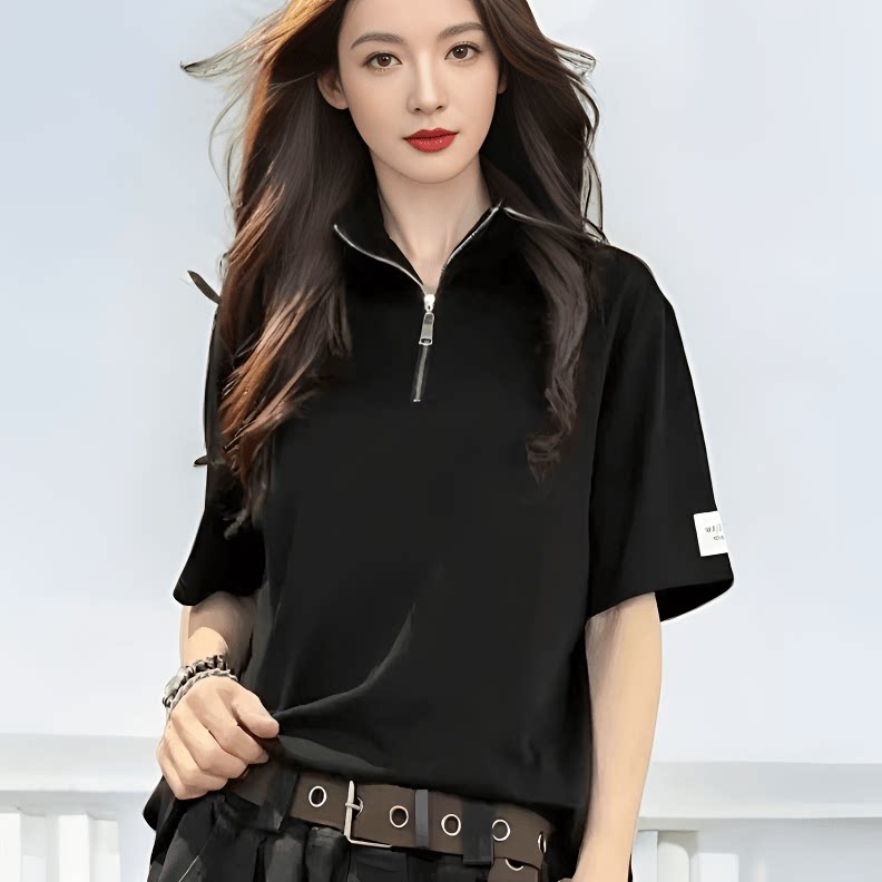 百搭休闲立领T恤气质显瘦欧货上衣甜飒 立领纯棉女衫 夏季 拉链短袖