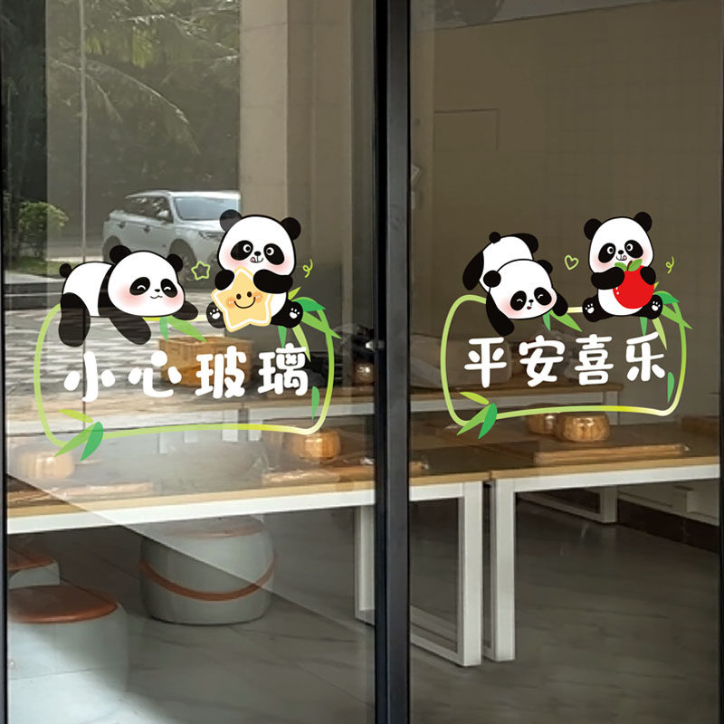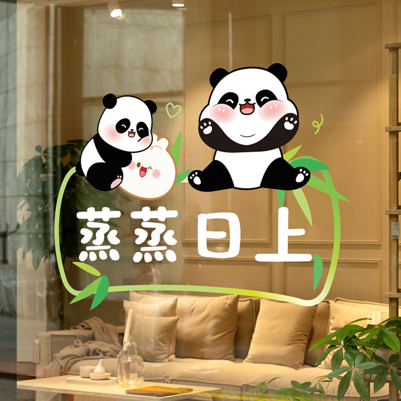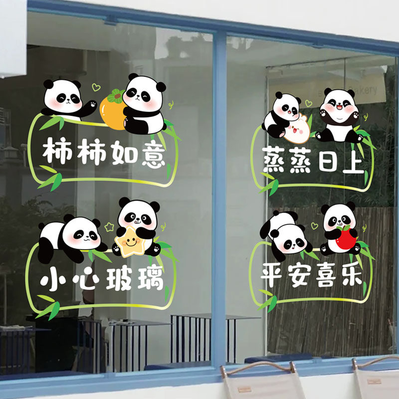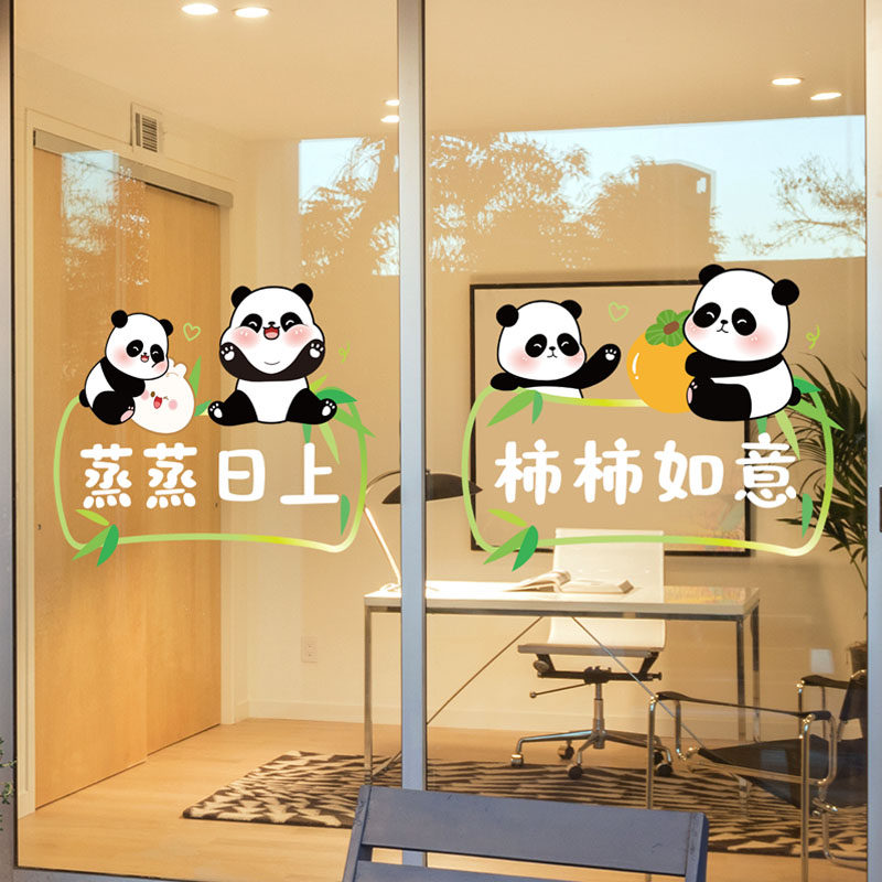 卡通熊猫小心玻璃装 饰玻璃贴纸厨房推拉门蒸蒸日上无胶静电窗花贴